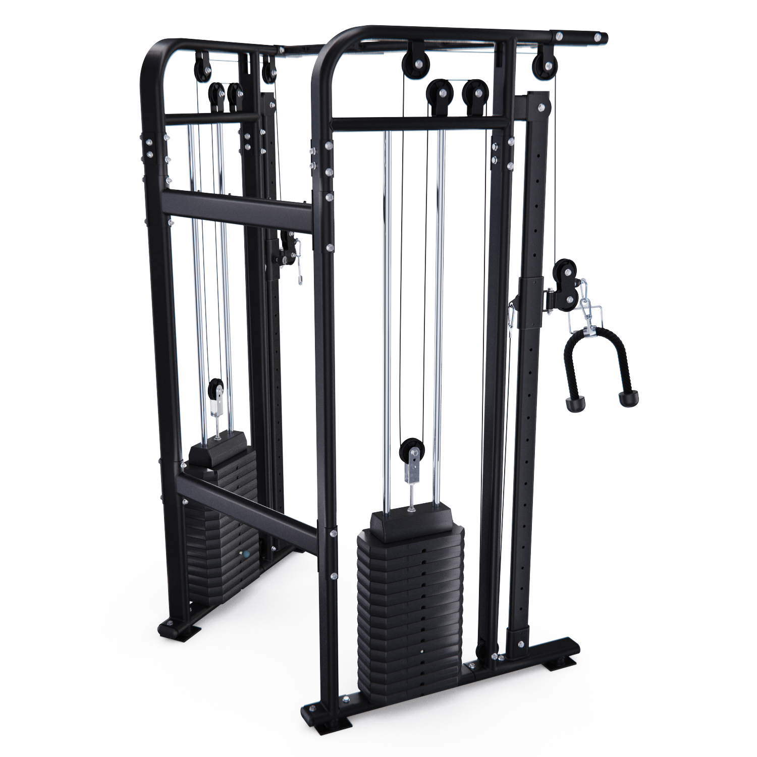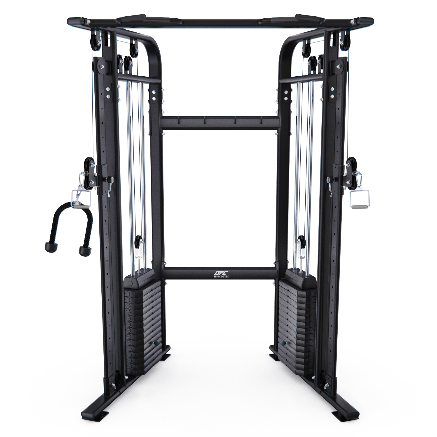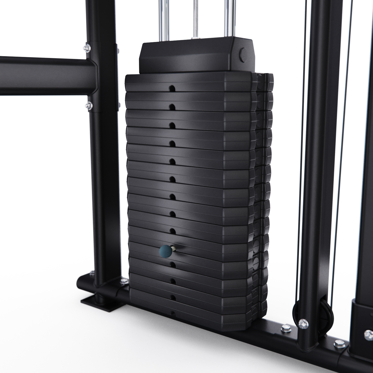Силовые стеки весом по 90 кг входят в комплектацию, а вес каждой пластины равен 6 кг. Плавность хода стеков обеспечивают ролики на подшипниках. Конструкция тренажёра выполнена из высококачественной стали и обеспечивает его устойчивость и надёжность.