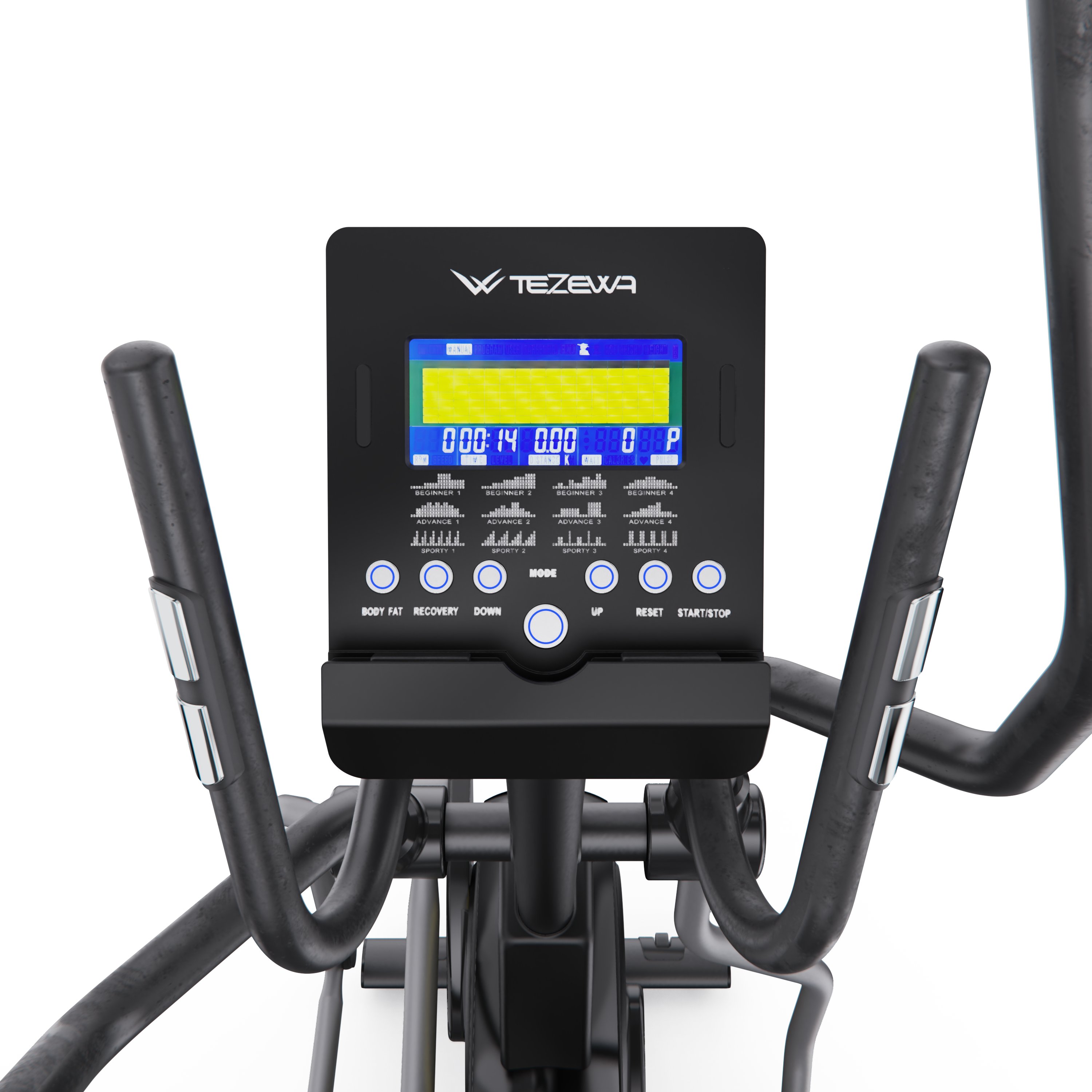 На встроенном LCD-дисплее с синей подсветкой отображаются все важные параметры тренировки: время, скорость, дистанция, калории, пульс (сенсорные датчики на поручнях), обороты в минуту (RPM), а также мощность в ваттах и выбранную программу. В тренажёре уже запрограммировано 12 тренировочных режимов, что делает занятия более разнообразными и результативными.