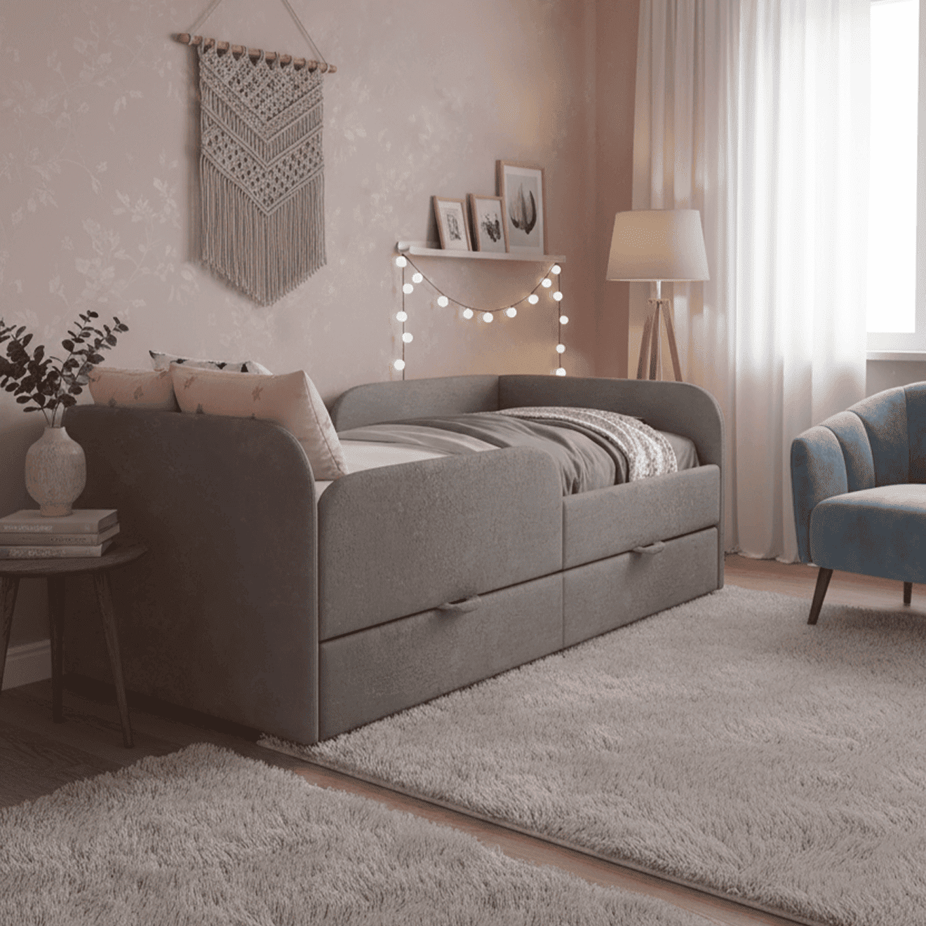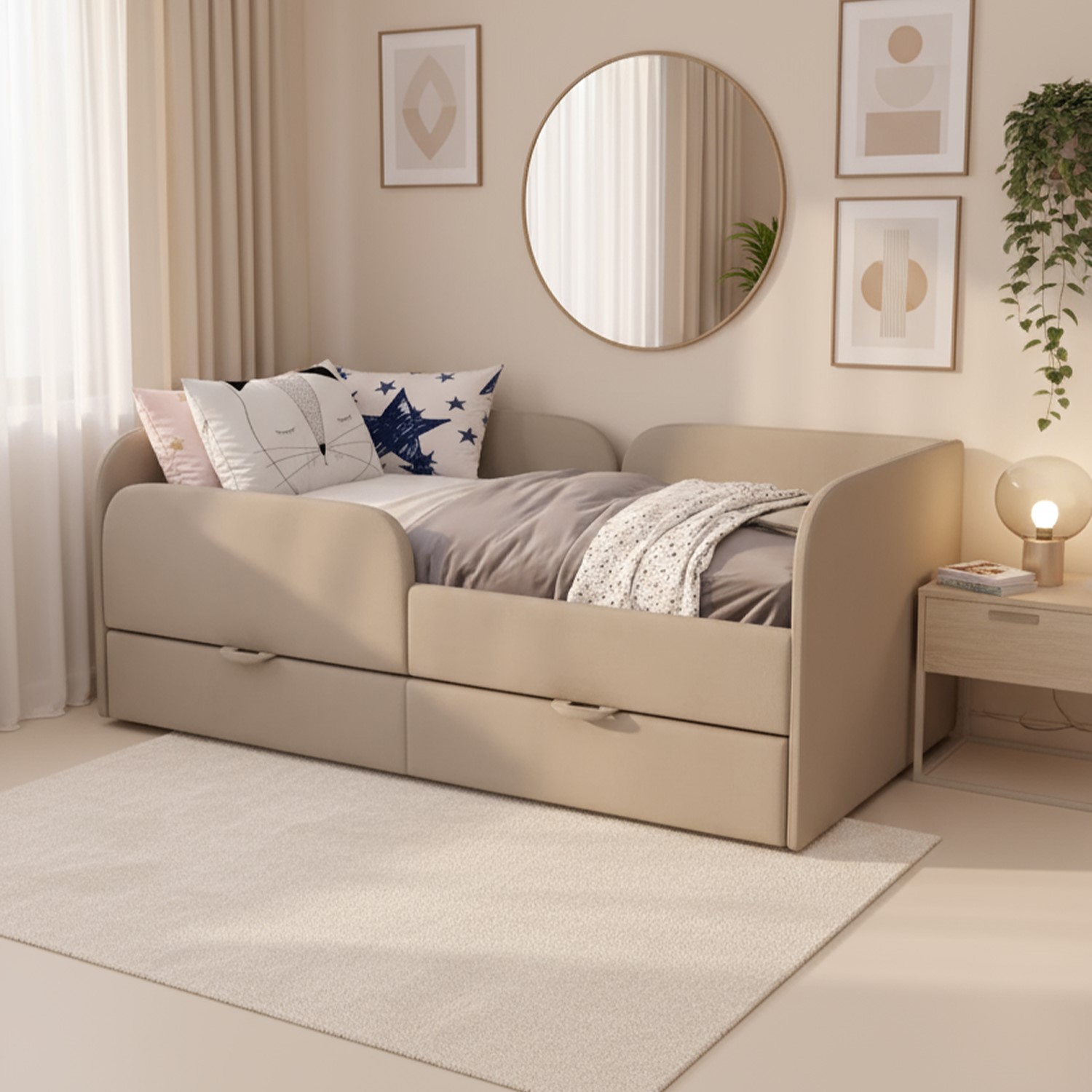* Безопасность. Мы заботимся о безопасности ваших детей. Бортик кровати предотвращает падение во время сна, а мягкие формы исключают возможность травм.