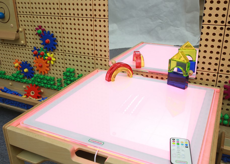 В комплекте с панелью идет пульт ДУ, с помощью которого можно менять цветовую гамму подсветки панели: изменить цвет подсветки на любом из основных цветов (красный, желтый и синий) или второстепенных цветов (оранжевый, фиолетовый и зеленый) или плавно переходить между ними. Также имеются 3 режима (чередование цветов радуги, гроза и чередование успокаивающих цветов), которые воспитатель может использовать при проведении занятий.