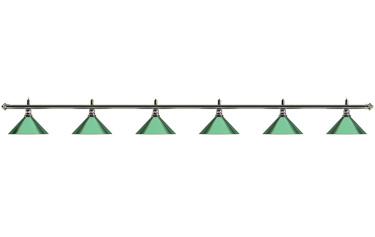 Изящная лампа классического дизайна органично впишется в любой интерьер. Устойчивые к механическим повреждениям металлические плафоны на металлической штанге обеспечивают не только качественное освещение игрового поля, но и создадут уютную атмосферу в бильярдном клубе или кабинете. Комплектуется цепочками и чашками для крепления к потолку. Предназначена для равномерного освещения игрового поля 10 - 12 футовых столов.