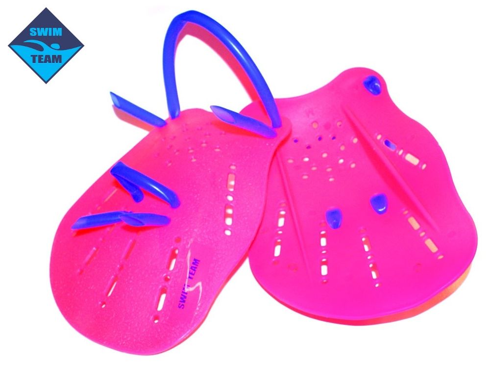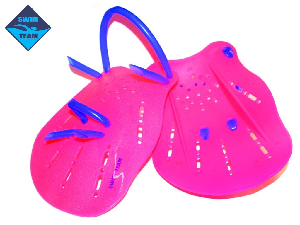 Лопатки для плавания SWIM TEAM. Такие лопатки обладают удобными ремнями, которые легко регулируются, хорошо фиксируя пальцы и запястье. Лопатки отлично подойдут как новичкам во время обучения плаванью, так и профессиональным спортсменам. Современная гидродинамическая форма обеспечит тренировку мышц ладони и рук в целом. Рельефная поверхность не позволит ладони скользить, обеспечивая сцепление с поверхностью лопатки. Лопатки в индивидуальной упаковке с замком и подвесом.