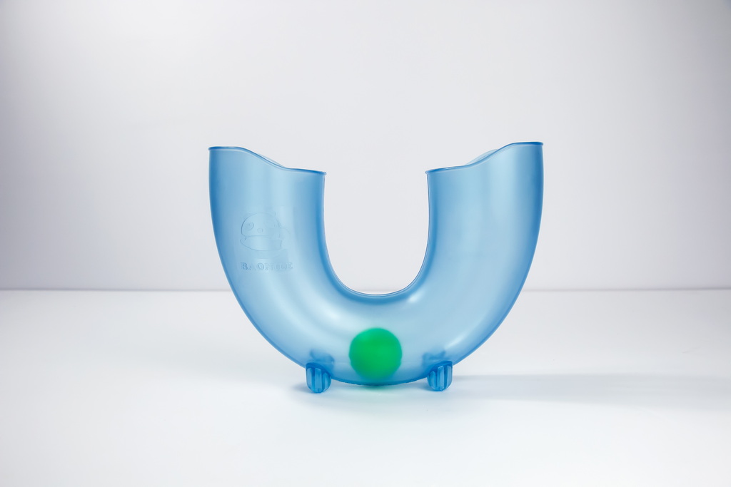 Спортивный инвентарь «Лови-бросай», представляет собой U-образную пластиковую широкую трубку голубого цвета (размером: 23,5 х 8,5 х 17,5 см) и 3 разноцветных шарика (различные по размеру).