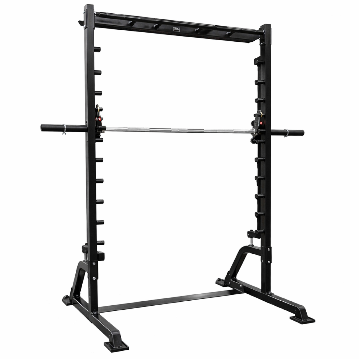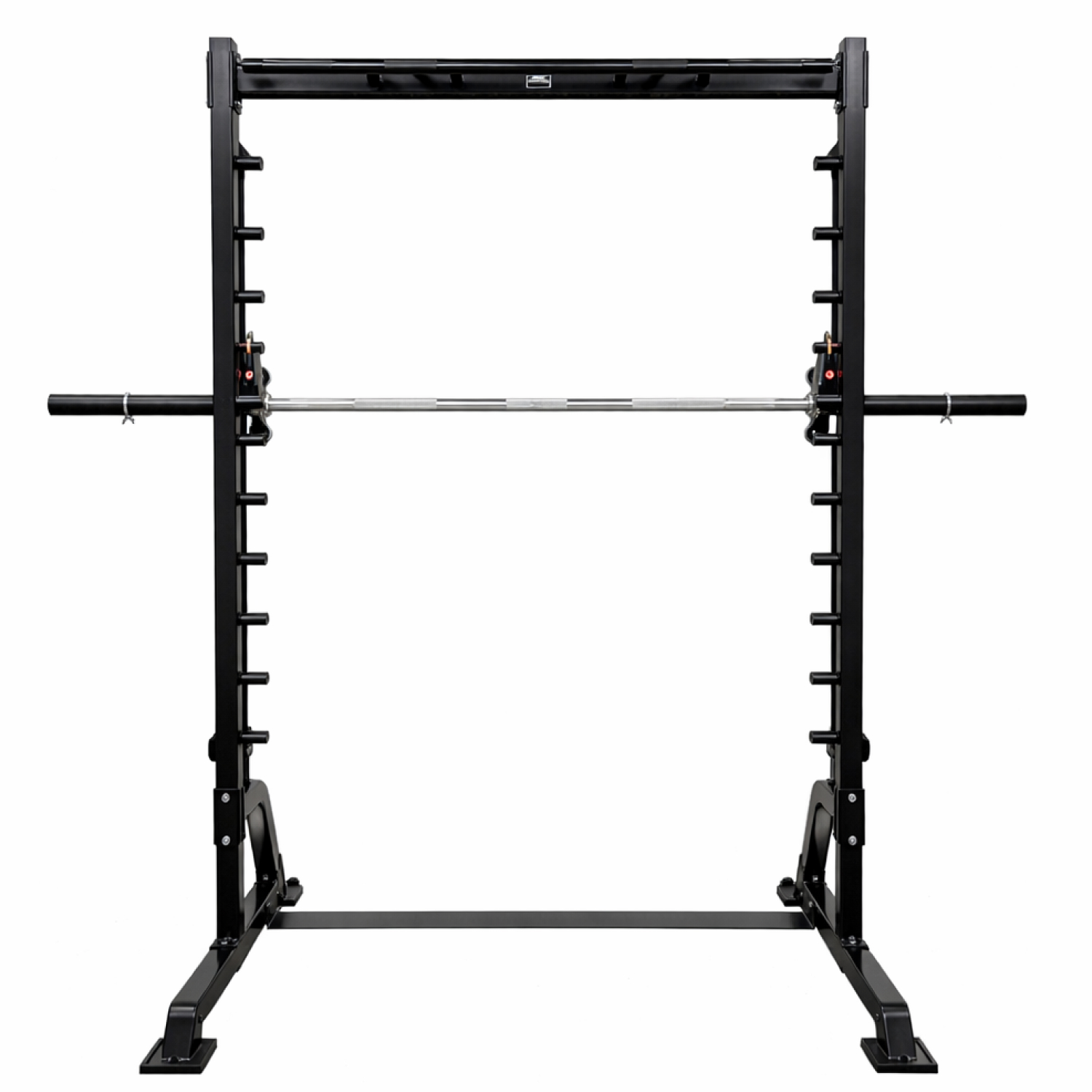 Машина Смита представляет собой силовой тренажёр с массивной стальной рамой чёрного цвета, предназначенный для безопасных и эффективных тренировок. Конструкция выполнена в виде устойчивой прямоугольной рамы с двумя основными вертикальными направляющими, по которым движется гриф, и множеством уровней фиксации по всей высоте стоек, что позволяет устанавливать стартовое и конечное положение штанги на разных уровнях.