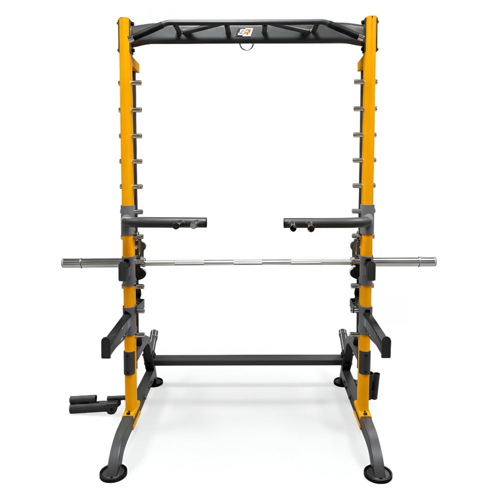 Машина Смита представляет собой силовой тренажёр с прочной стальной рамой, выполненной в жёлто-чёрной цветовой гамме. Конструкция имеет устойчивую П-образную форму и оснащена двумя основными вертикальными направляющими, по которым перемещается фиксированный гриф. По всей высоте стоек расположено множество уровней фиксации, позволяющих точно настраивать рабочую высоту штанги под различные упражнения и рост пользователя.