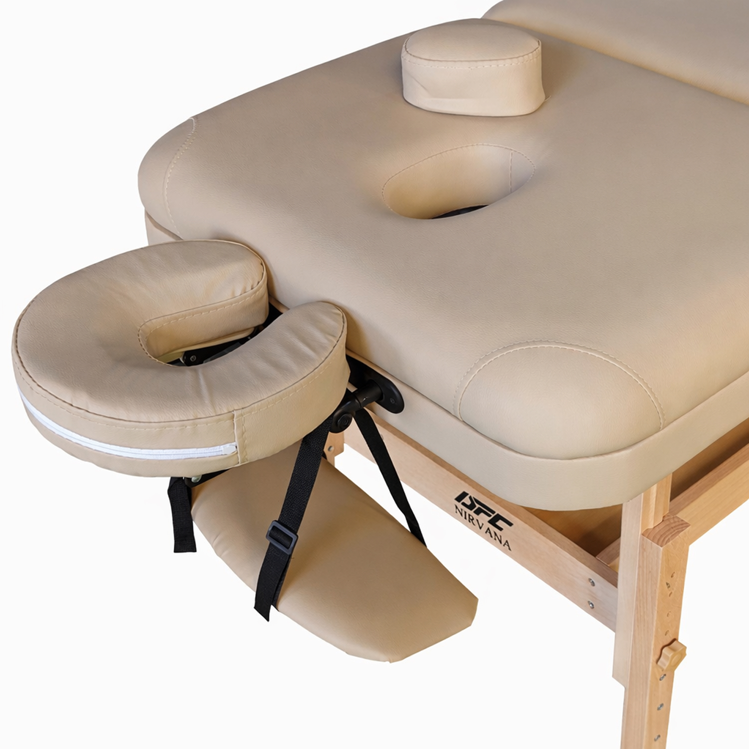В комплект входит съемный подголовник с регулировкой высоты. Он легко настраивается под рост клиента и тип массажа. Также предусмотрен люверс для лица с заглушкой, что делает стол удобным для классического массажа в положении лежа.