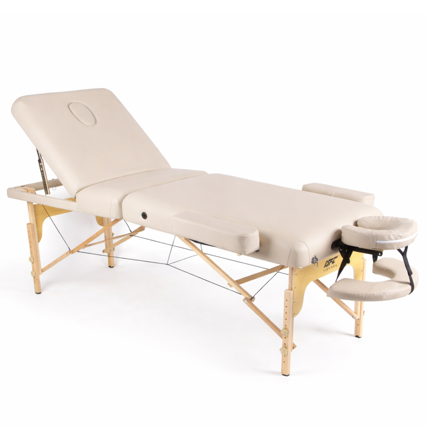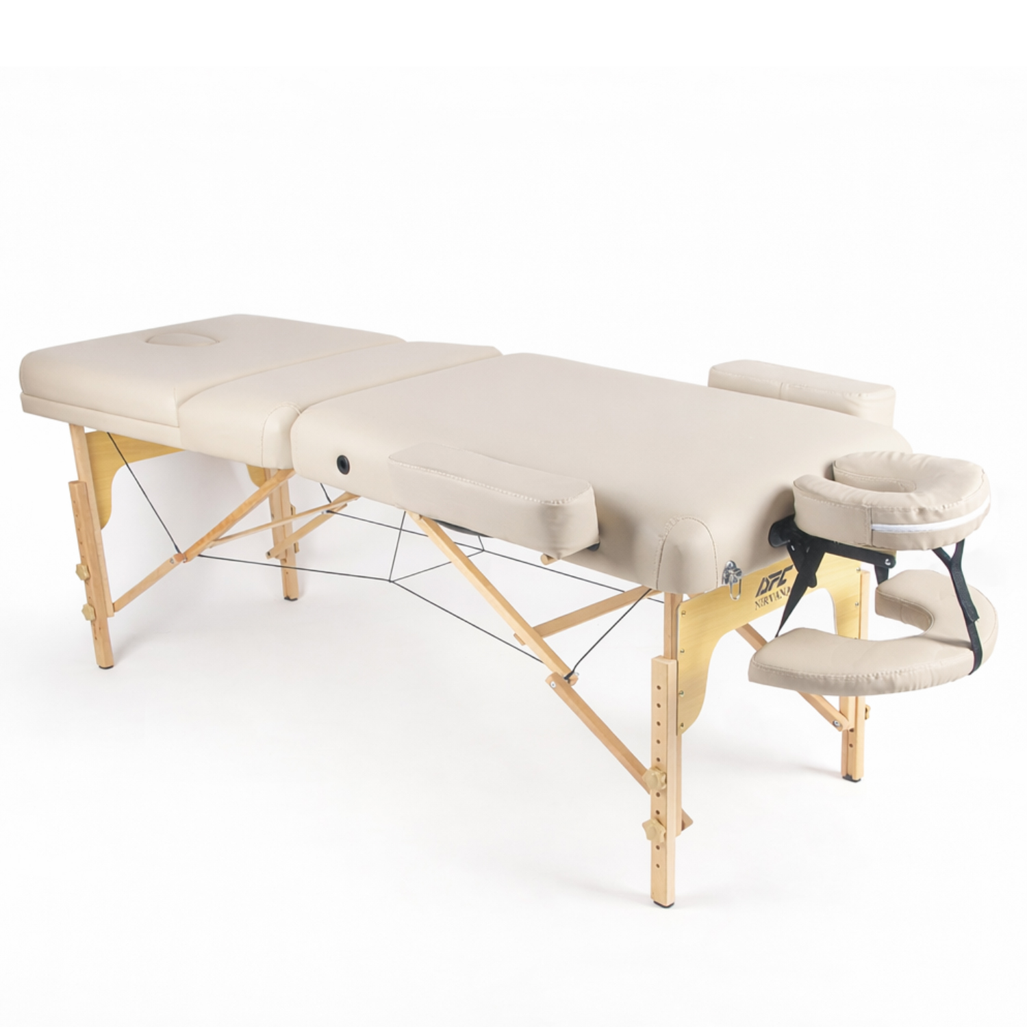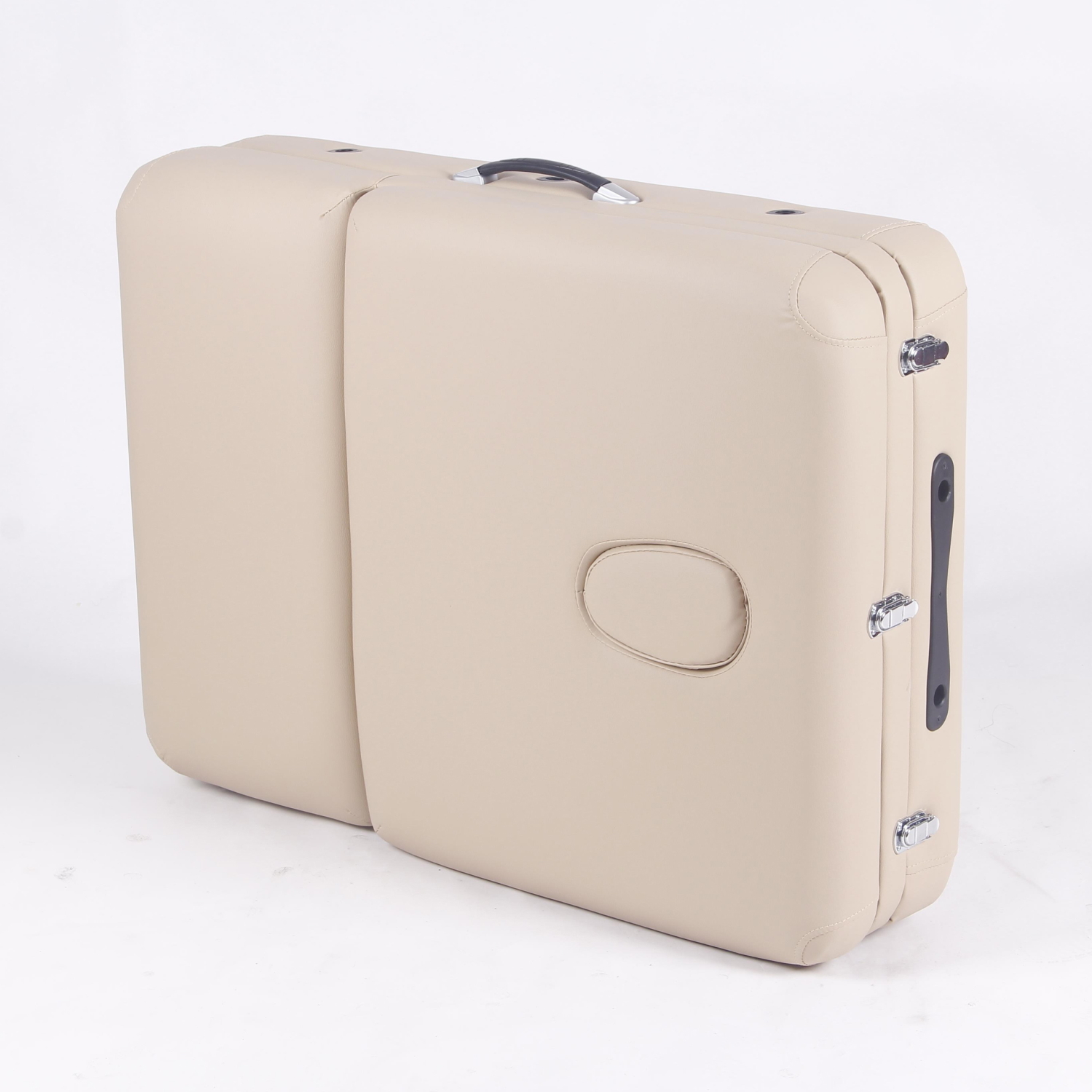 В комплект входит съемный алюминиевый подголовник с регулировкой высоты, который легко настраивается под рост клиента. Также предусмотрен люверс для лица с заглушкой, что делает стол удобным для классического массажа в положении лежа.