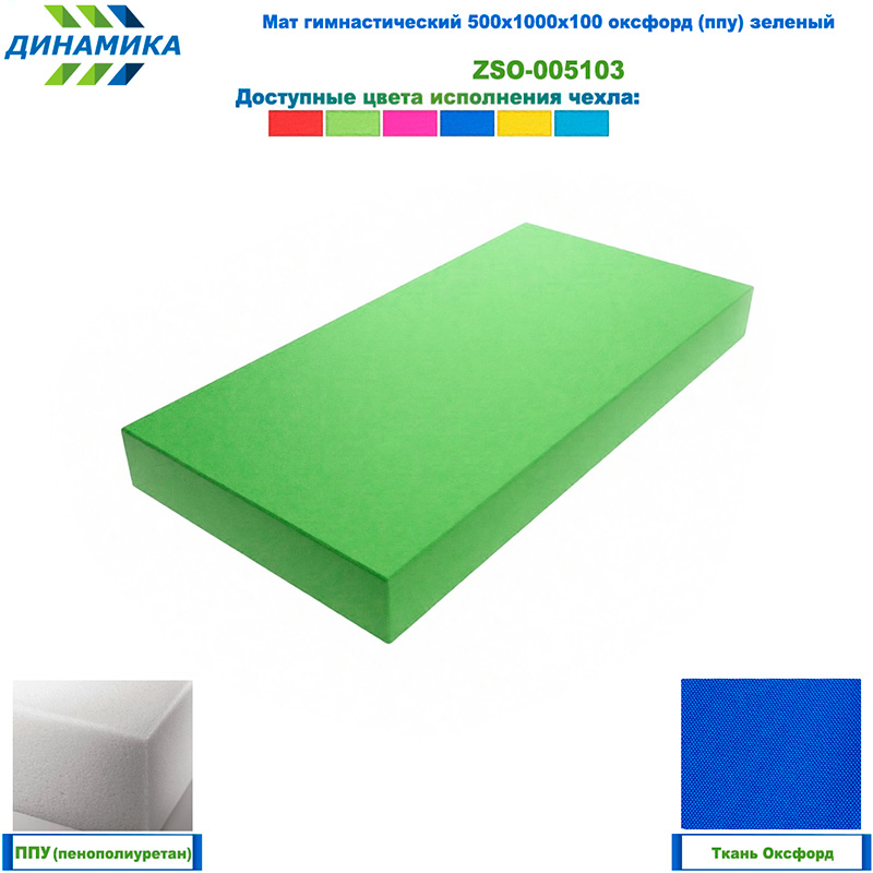 Мат спортивный представляет собой мягкое изделие, состоящее из чехла сшитого из ткани оксфорд и наполнителя - прочного поролона (ППУ - пенополиуретан плотностью 19,3 кг/м3). Прочность гимнастического мата гарантирует безопасность спортсменов при падениях во время тренировок. Мат оснащен молнией со скрытым замком, что позволяет легко заменять наполнитель.