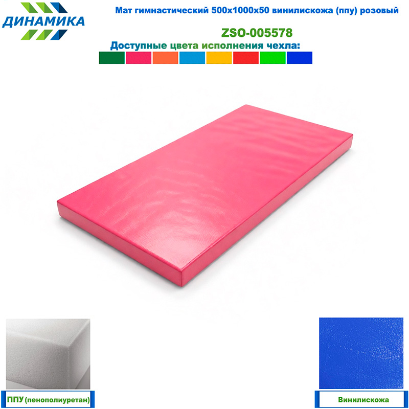 Гимнастический мат 500 × 1000 × 50 мм, розовый (винилискожа, наполнитель — ППУ)