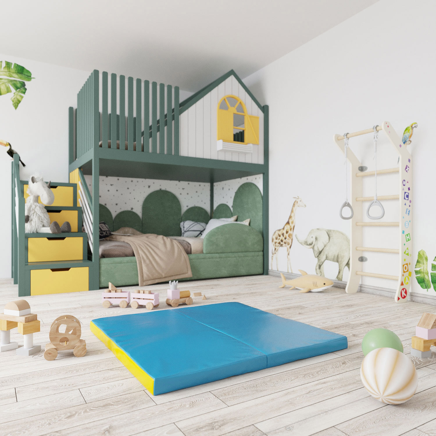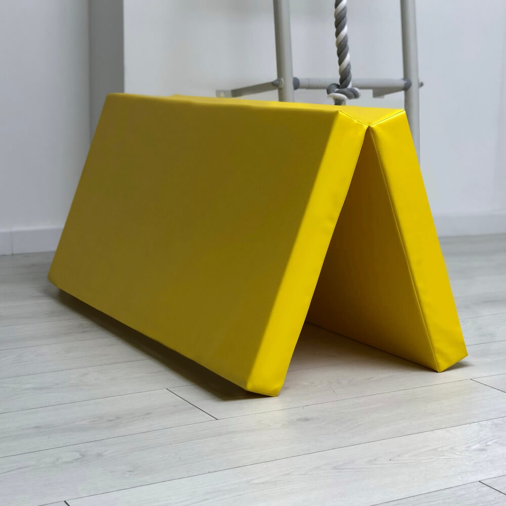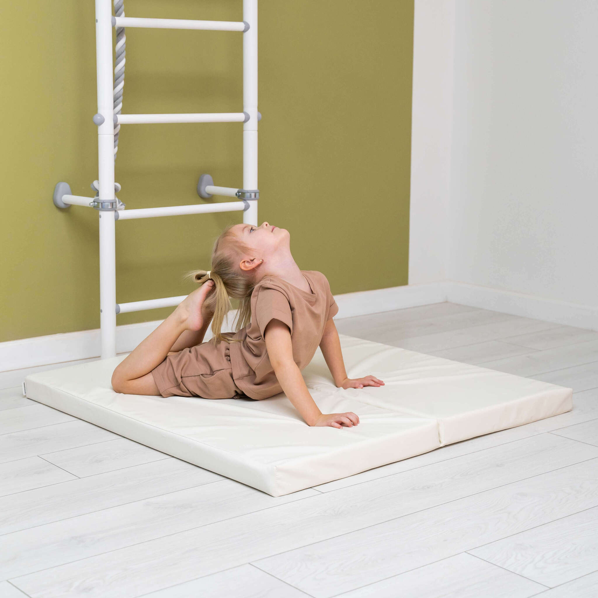 Материал устойчив к царапинам, грязи и влаге, что делает его долговечным в использовании и легким в уходе — достаточно протереть влажной салфеткой. Складной мат не занимает много места, его удобно хранить прямо за шведской стенкой.