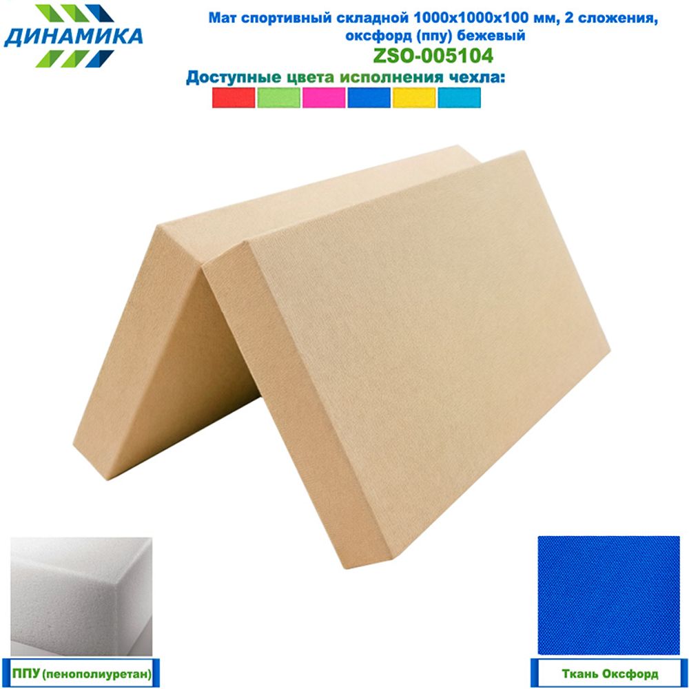 Спортивный складной мат 1000 × 1000 × 100 мм, 2 сложения, бежевый (ткань «Оксфорд», наполнитель — ППУ)