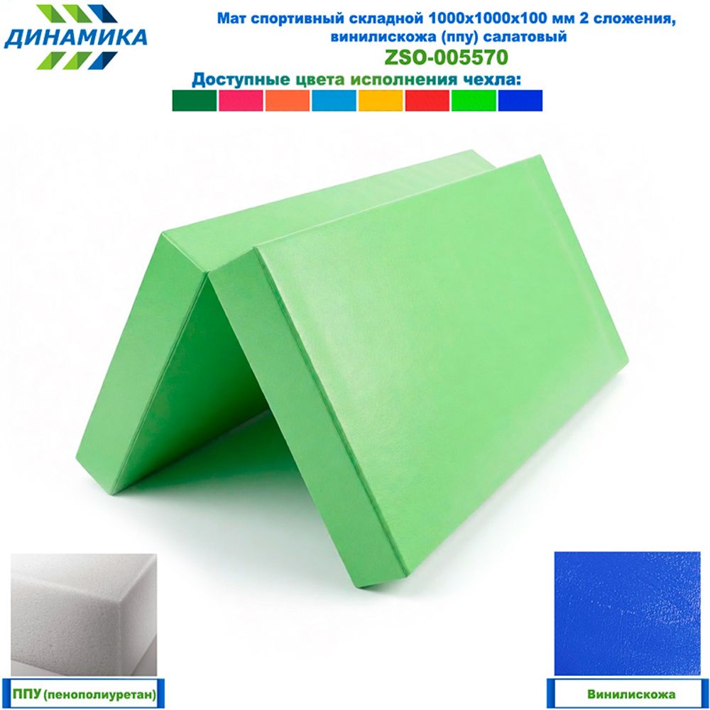 Спортивный складной мат 1000 × 1000 × 100 мм, 2 сложения, салатовый (винилискожа, наполнитель — ППУ)