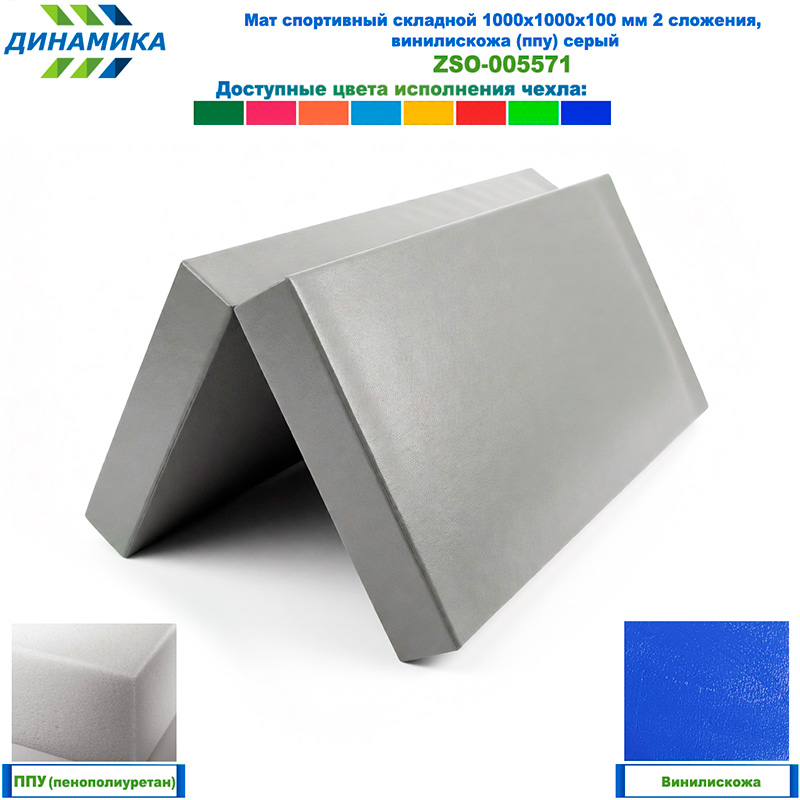 Спортивный складной мат 1000 × 1000 × 100 мм, 2 сложения, серый (винилискожа, наполнитель — ППУ)