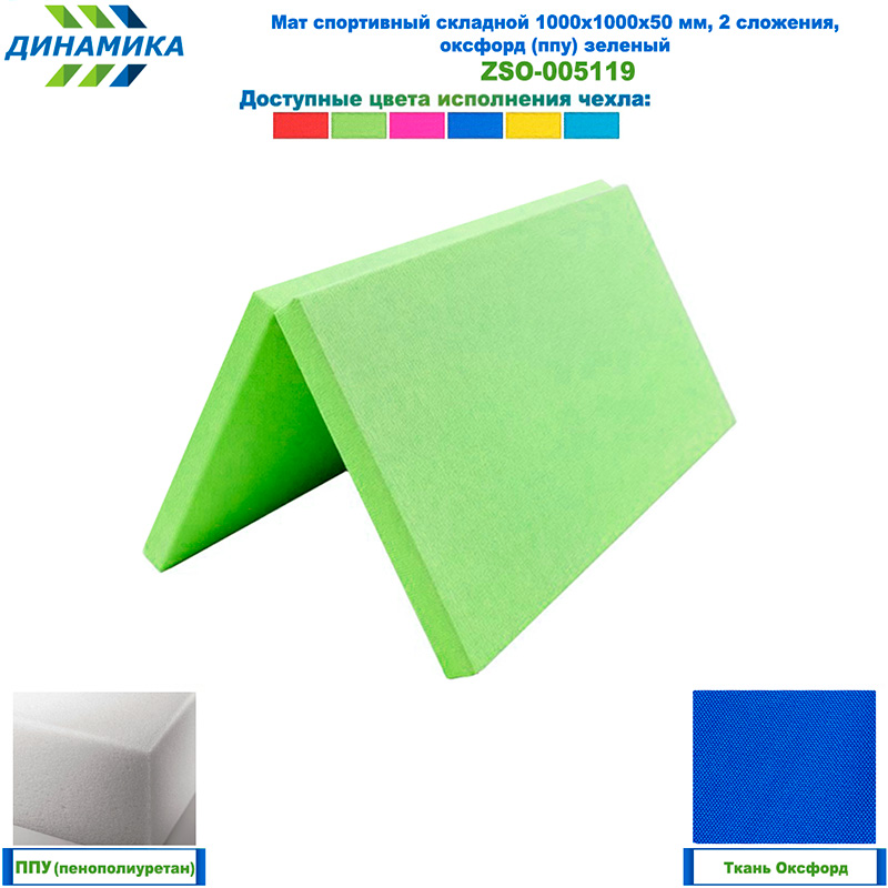Спортивный складной мат 1000 × 1000 × 50 мм, 2 сложения, зеленый (ткань «Оксфорд», наполнитель — ППУ)