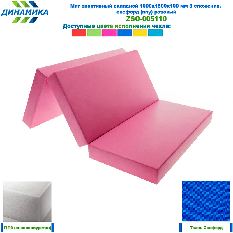Спортивный складной мат 1000 × 1500 × 100 мм, 3 сложения, розовый (ткань «Оксфорд», наполнитель — ППУ)