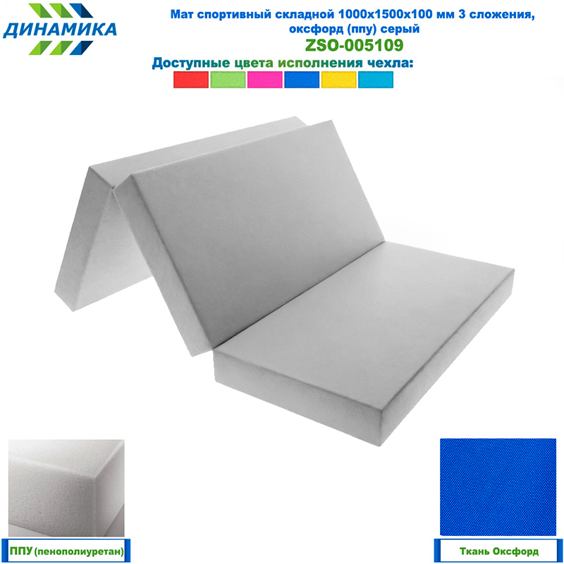 Спортивный складной мат 1000 × 1500 × 100 мм, 3 сложения, серый (ткань «Оксфорд», наполнитель — ППУ)