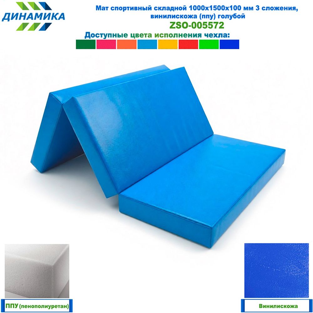 Спортивный складной мат 1000 × 1500 × 100 мм, 3 сложения, голубой (ткань винилискожа, наполнитель — ППУ)