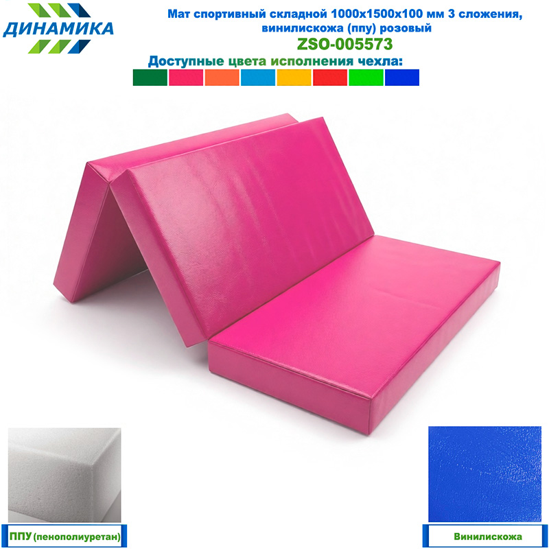 Спортивный складной мат 1000 × 1500 × 100 мм, 3 сложения, розовый (ткань винилискожа, наполнитель — ППУ)
