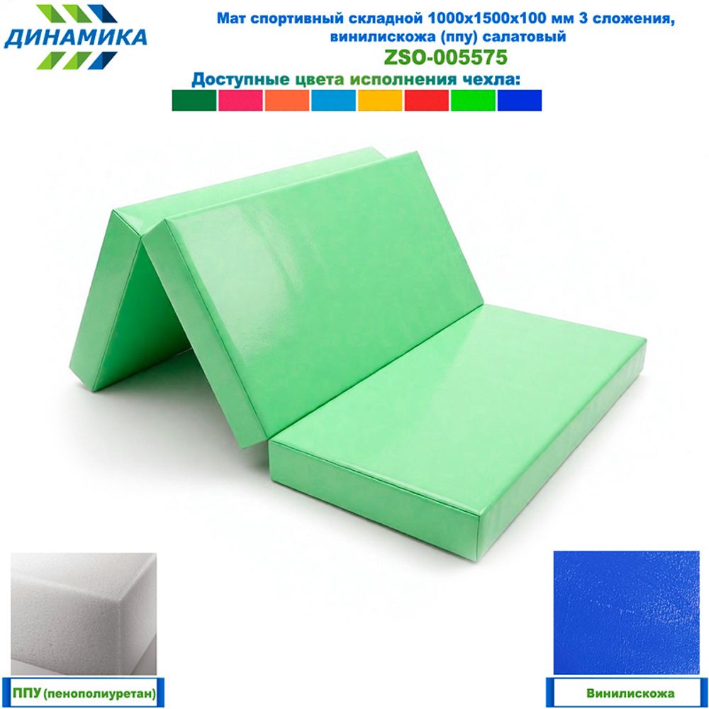 Спортивный складной мат 1000 × 1500 × 100 мм, 3 сложения, салатовый (ткань винилискожа, наполнитель — ППУ)