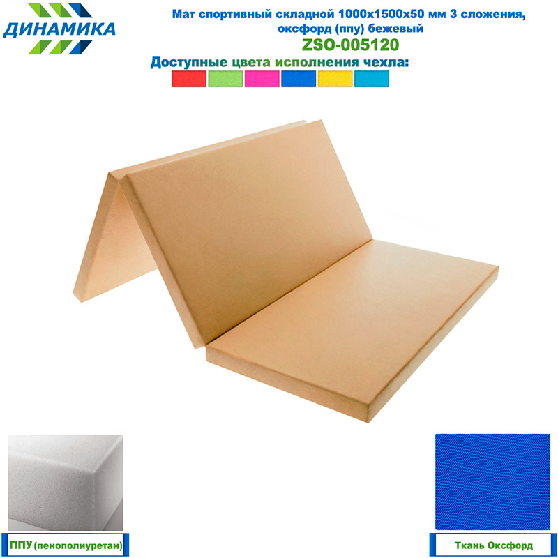 Спортивный складной мат 1000 × 1500 × 50 мм, 3 сложения, бежевый (ткань «Оксфорд», наполнитель — ППУ)