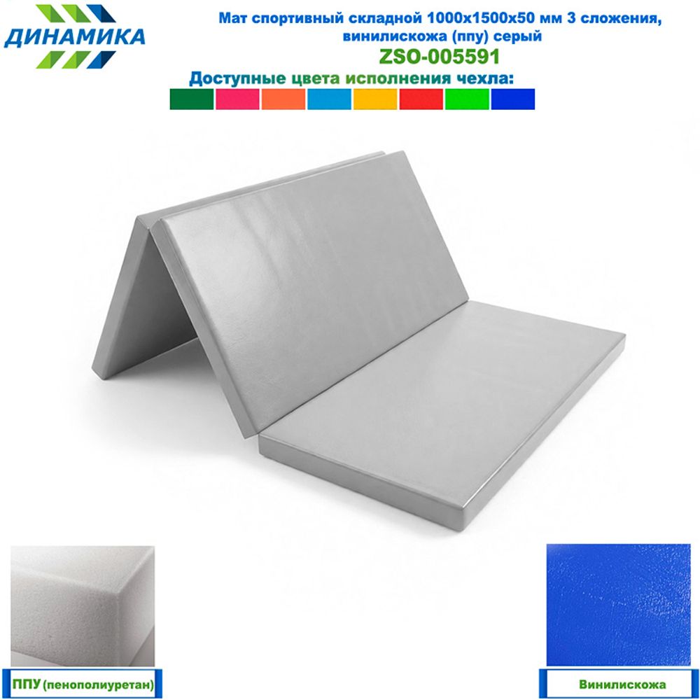 Спортивный складной мат 1000 × 1500 × 50 мм, 3 сложения, серый (ткань винилискожа, наполнитель — ППУ)