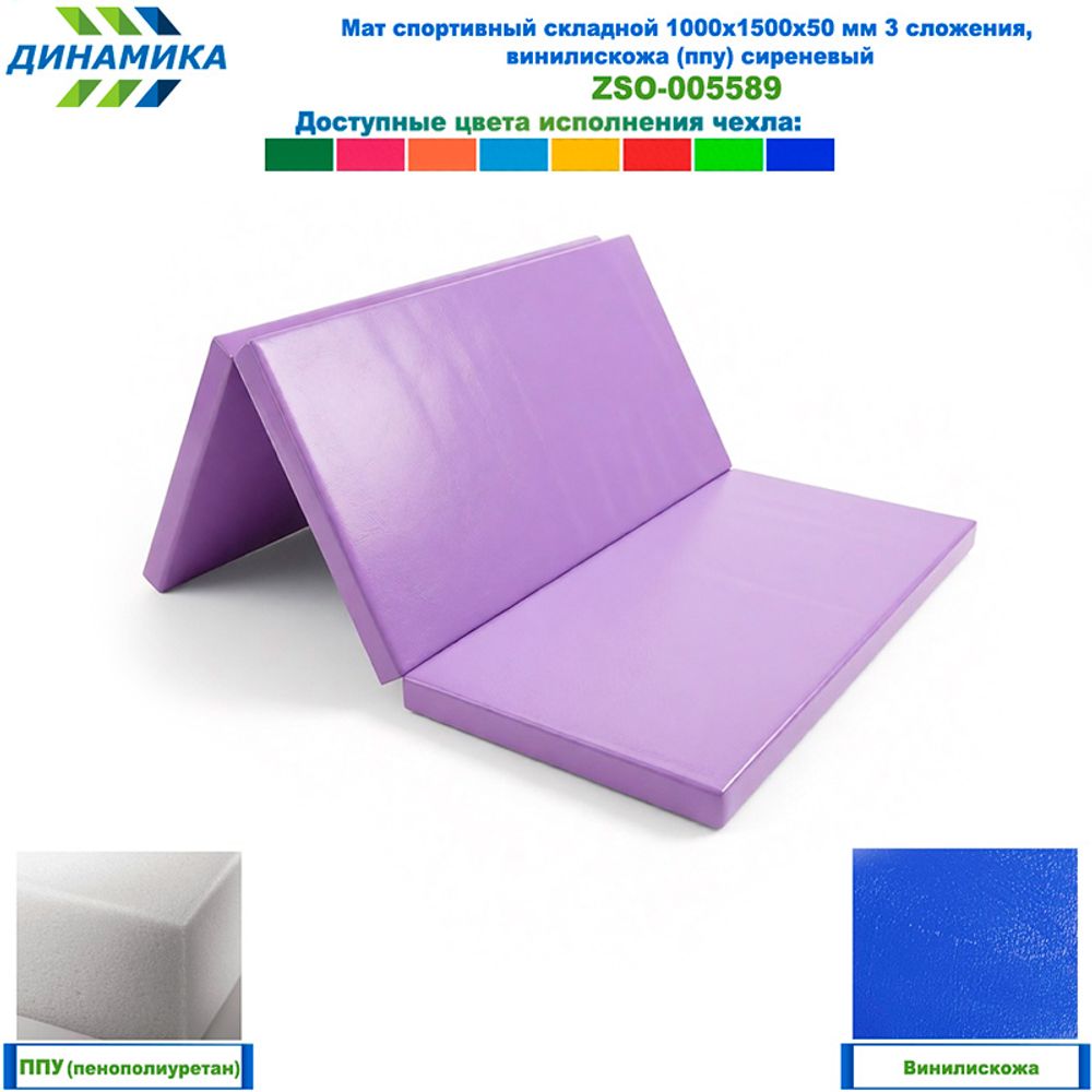 Спортивный складной мат 1000 × 1500 × 50 мм, 3 сложения, сиреневый (ткань винилискожа, наполнитель — ППУ)