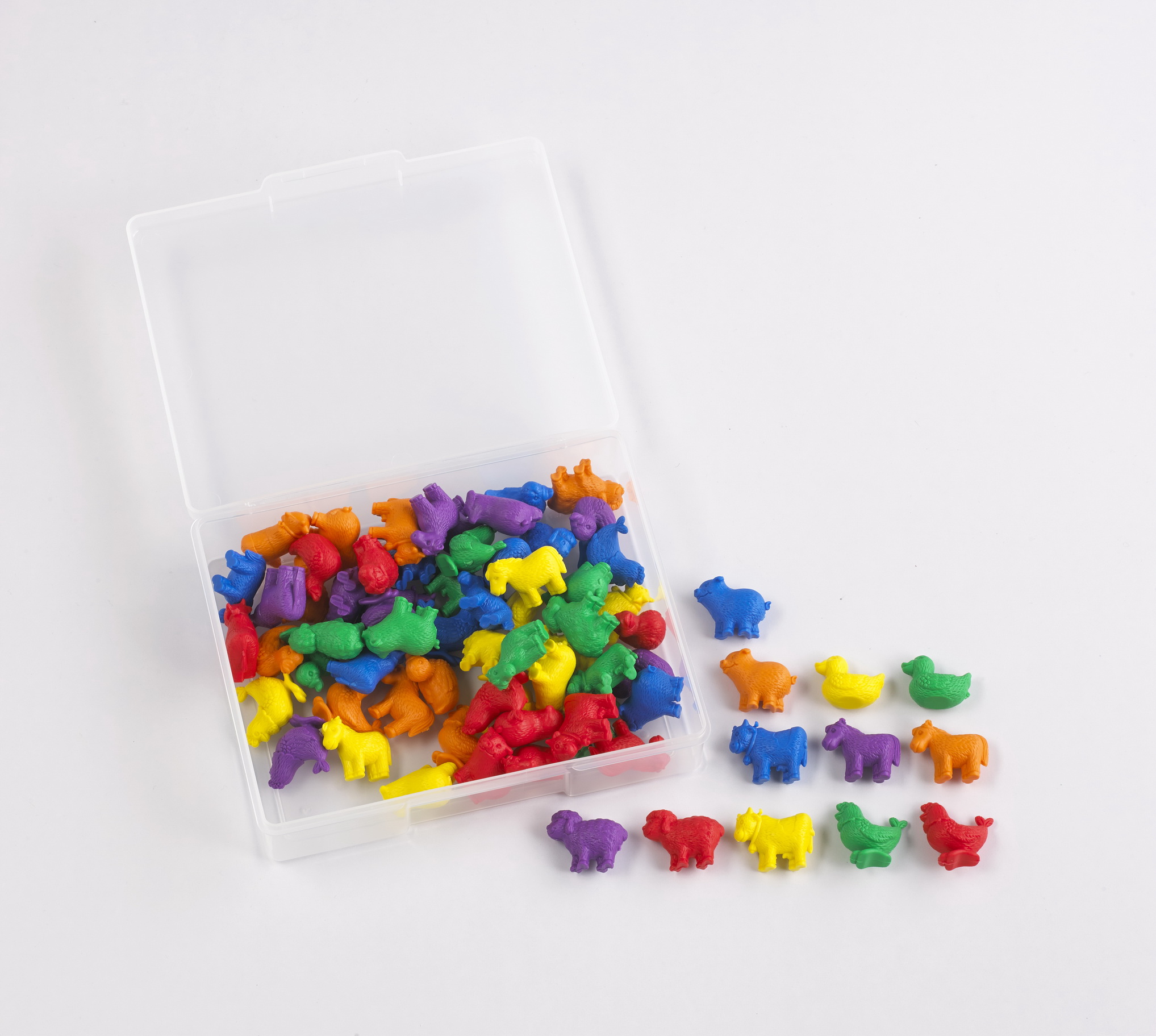 В наборе 72 фигурки домашних животных, 6 ярких цветов. Фигурки представлены в виде: курицы, коровы, утки, лошади, свиньи и барана. Каждая фигурка в двойном экземпляре.
