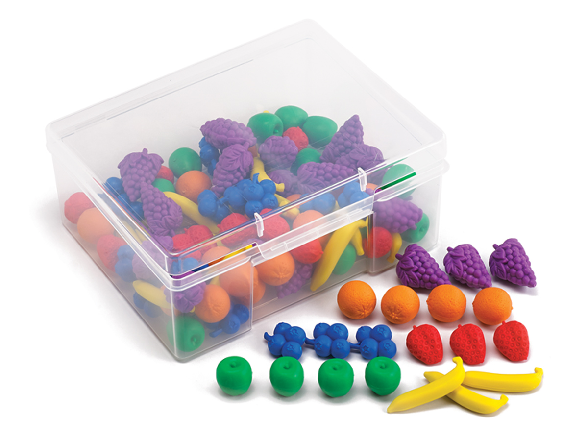 В наборе 108 деталей в виде фруктов, 6 ярких цветов. Фигурки: яблоко, банан, апельсин, черника, виноград и клубника.