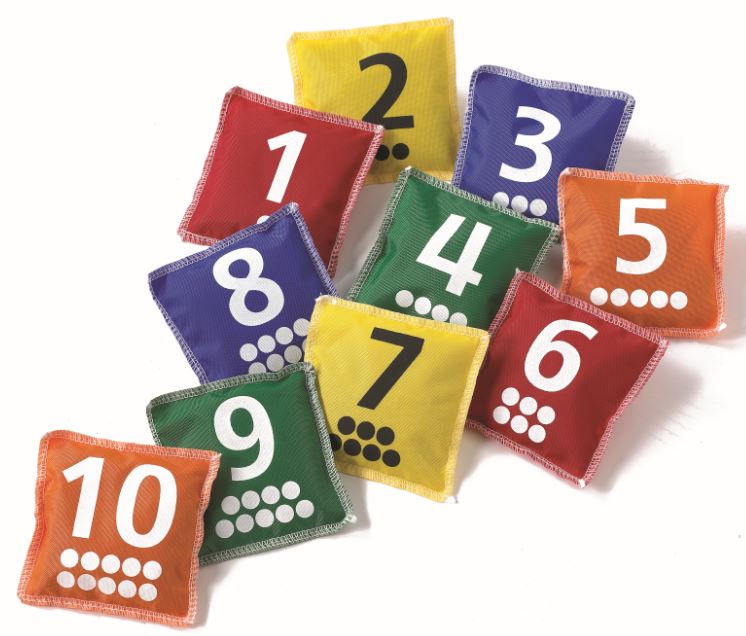 В наборе мешочки с числами от 1 до 10 (с сыпучим материалом внутри) в 5 цветах.