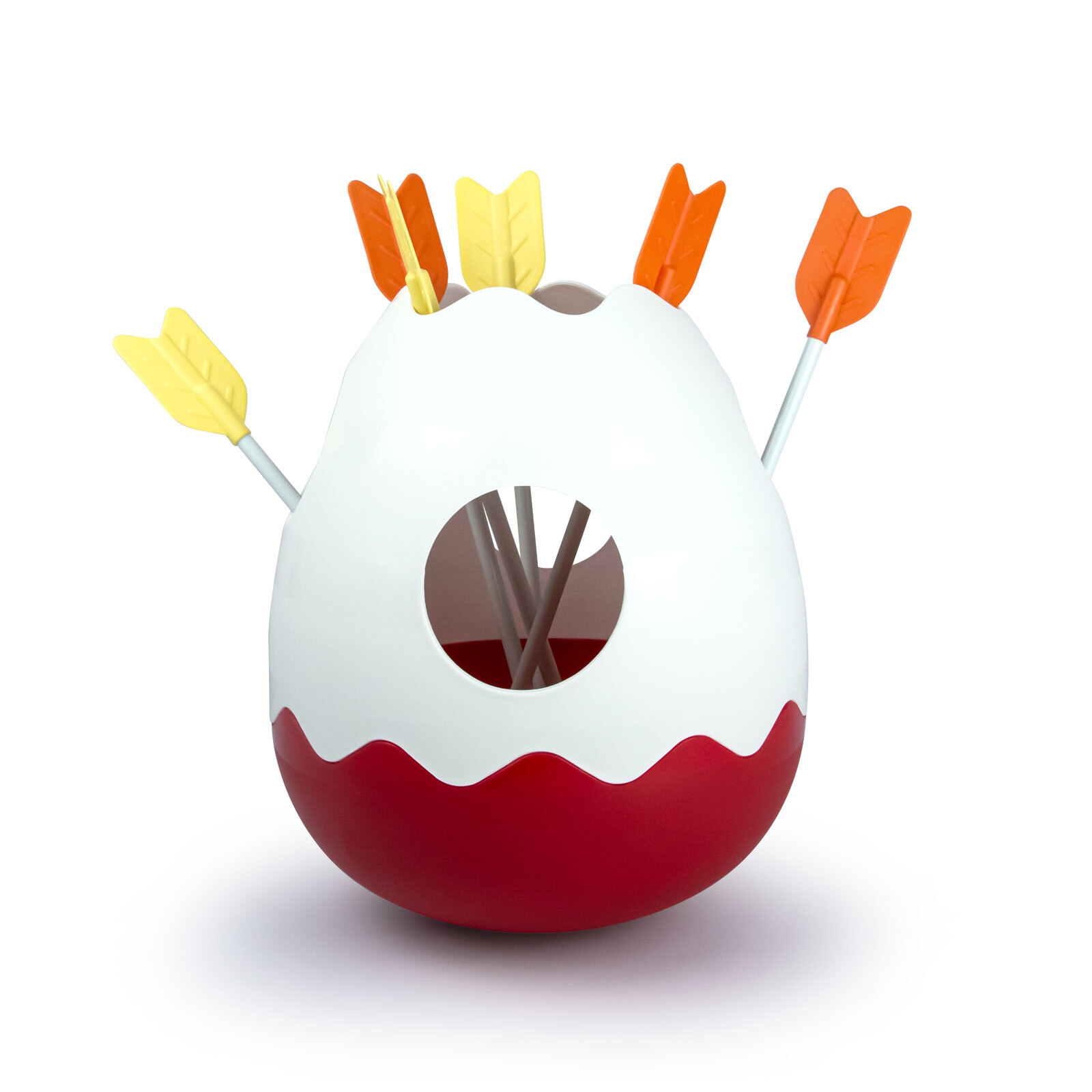 Игровой набор для метания, представлен в виде яйца и стрел. Цель игры: набрать большее количество очков, метая стрелы в лунки яйца. Каждой лунке присваивается балл в зависимости от уровня сложности. Яйцо в процессе игры можно раскачивать или вращать для увеличения сложности. Набор способствует физическому развитию детей. Развивает моторику и координацию движений, глазомер и меткость, умение ориентироваться в пространстве. Состав набора: • яйцо На внешней стороне яйца по всей площади нанесены кружки с цифрами от 1 до 5 для наклейки цветных стикеров с цифрами. • 6 стрел 2-х цветов Наконечники стрел выполнены из мягкого силикона в форме сердца, безопасны при использовании. • 10 стикеров с цифрами от 1 до 5 К набору прилагается руководство пользователя.