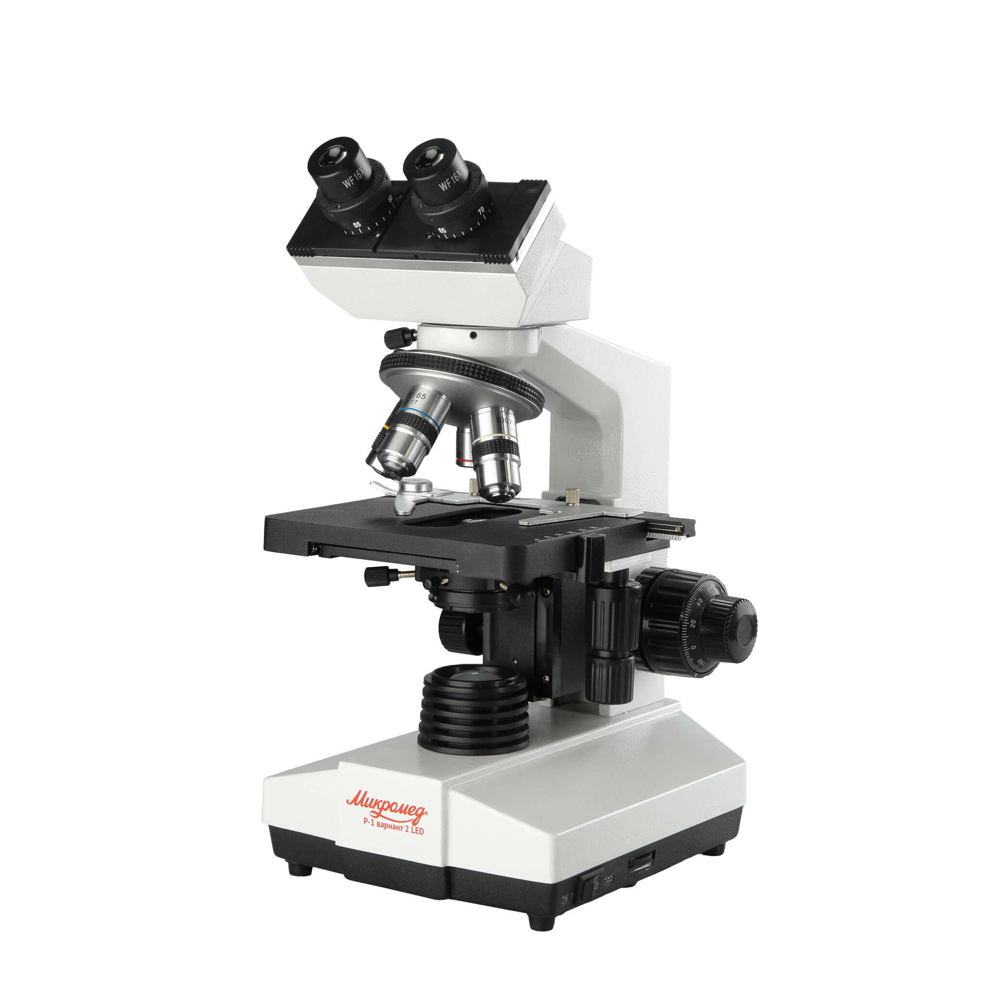Микроскоп Микромед Р-1 вариант 2 LED спроектирован на оптическую длину тубуса 160 мм. Оптическая система микроскопа включает в себя бинокулярную визуальную насадку, объективы на револьверном устройстве, коллектор и конденсор осветительного устройства с держателем светофильтров.
