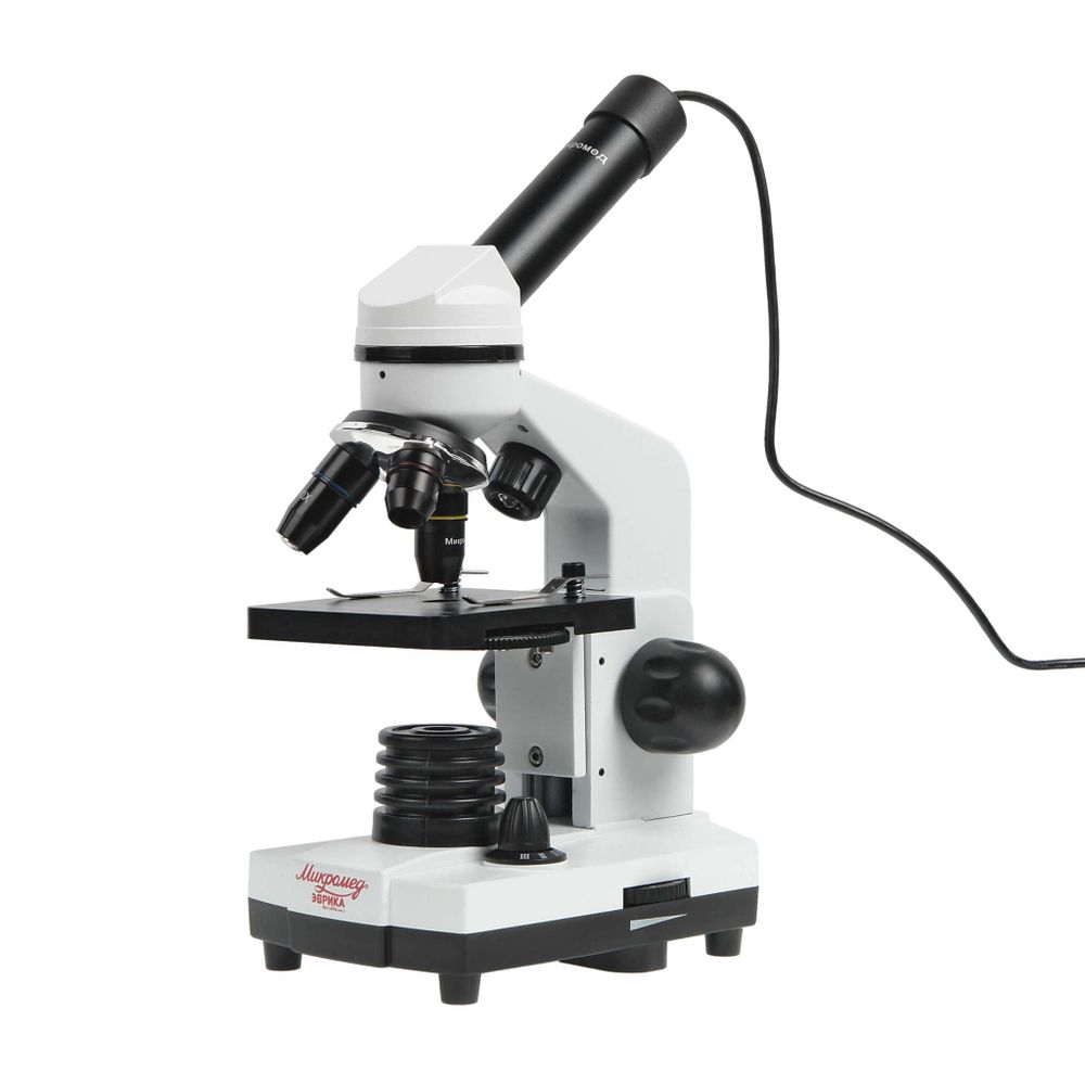 Микроскоп Эврика 40х-1600х (вар. 2) с видеоокуляром – бюджетный цифровой микроскоп из линейки учебных микроскопов Микромед, зарекомендовавших себя надежными инструментами высокого качества. За счет наличия в комплекте цифрового видеоокуляра световой микроскоп в считанные секунды превращается в цифровой – просто нужно заменить оптический окуляр на цифровой. Или, наоборот. При этом не требуется никаких дополнительных настроек. Микроскоп применяется в учебном процессе школ и лицеев для проведения лабораторных работ по многим дисциплинам - биологии, экологии, химии, физики и при проектно-исследовательской деятельности. Также он находит применение при самостоятельных исследованиях в домашних условиях.