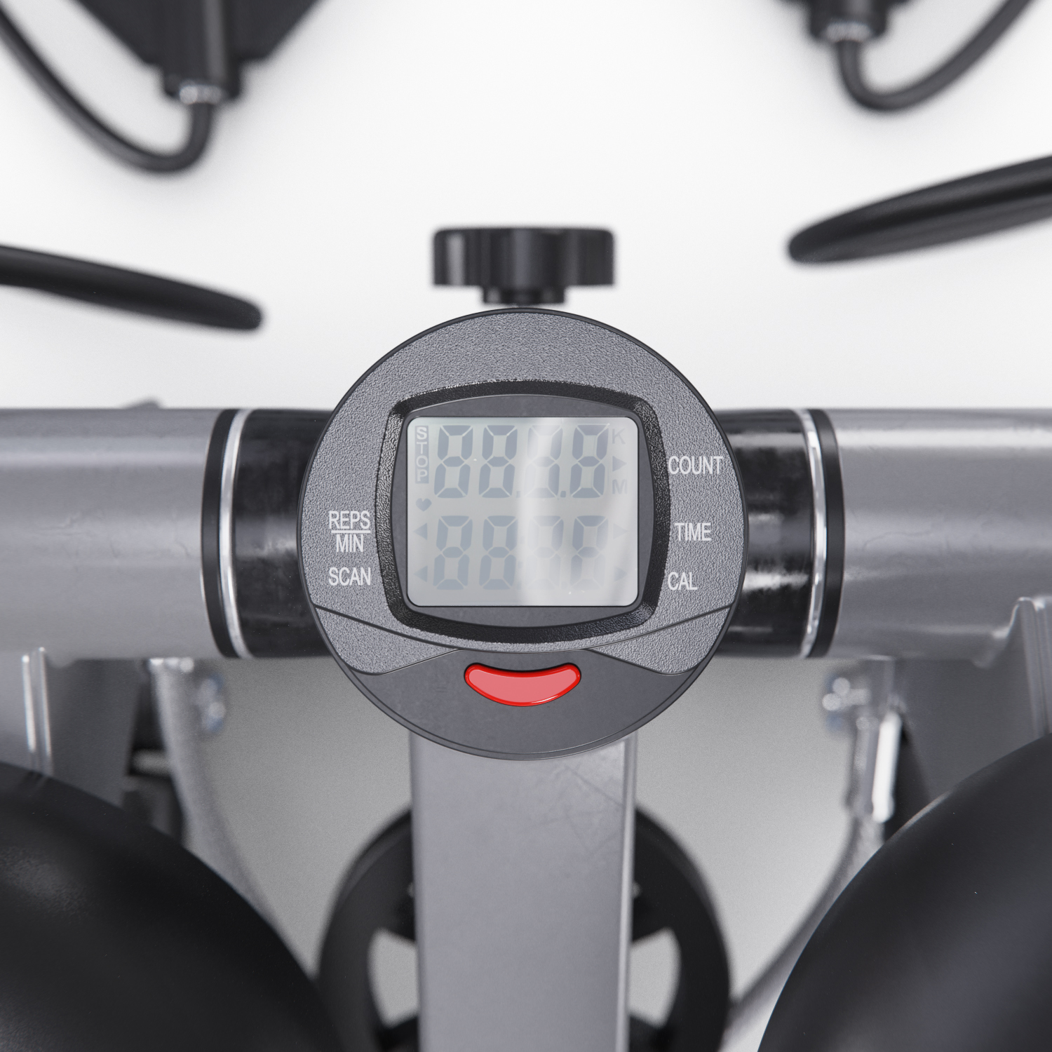 В комплекте с мини степпером идут съёмные эспандеры и инструменты для сборки и обслуживания. LCD дисплей степера показывает время, количество сожженных калорий, количество шагов, количество шагов в минуту и режим сканирования, делая ваши тренировки универсальными.