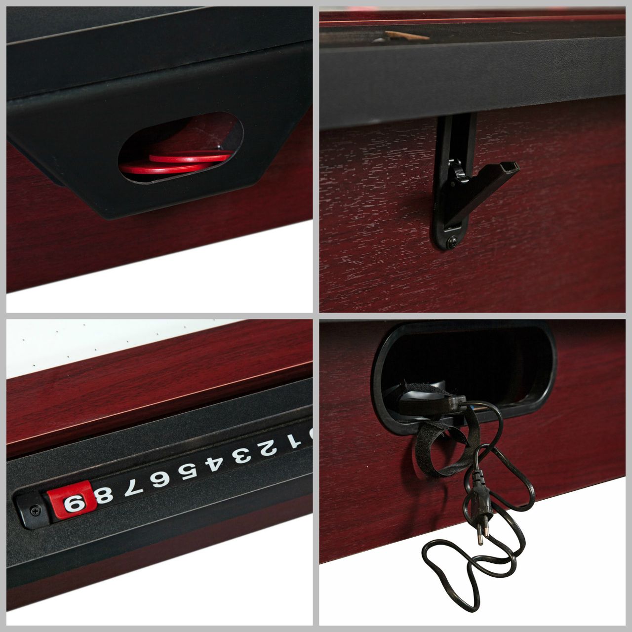 пул — 176 х 85 х 1,5 см; аэрохоккей — 184 х 94 х 0,3 см; теннис — 234 х 152 х 1,5 см; рулетка,покер,обеденный стол — 219 х 132 см