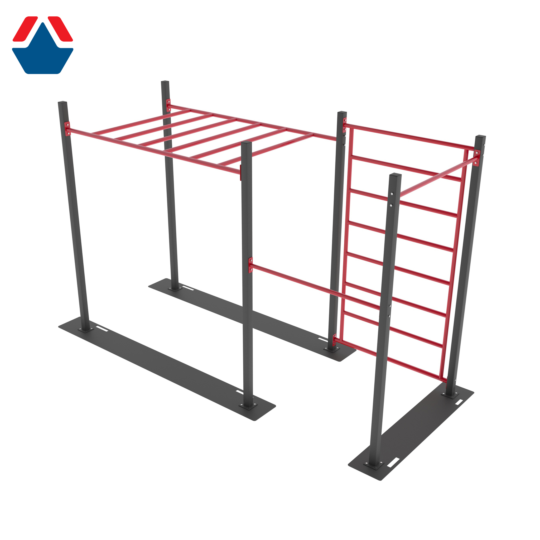 Спортивный комплекс, представляет собой сборную металлическую конструкцию состоящую из шести опорных столбов трубы квадратного профиля, с приварными площадками для крепления к пластинам основания, двух перекладин длиной L=1120 мм., с возможностью установки на различной высоте (изменение положения высоты перекладин производится за счет дополнительно предусмотренных отверстий в опорных столбах), а так же состоит из рукохода и шведской стенки. Монтаж элементов спортивного комплекса осуществляется с помощью болтового соединения. К каждому опорному столбу по два болтовых соединения на один элемент комплекса. Разборная конструкция спортивного комплекса имеет высокую прочность и позволяет легко производить её монтаж и демонтаж. Все элементы покрыты атмосферостойкой порошковой краской, нанесенной методом электростатического напыления с последующим обжигом в печи.