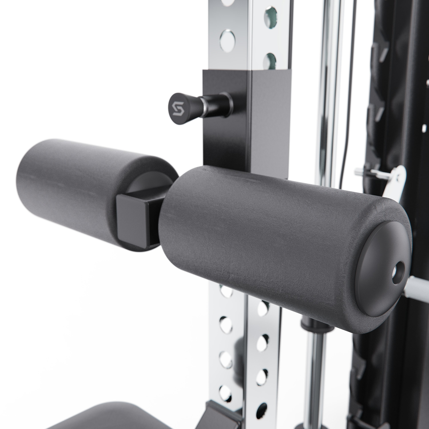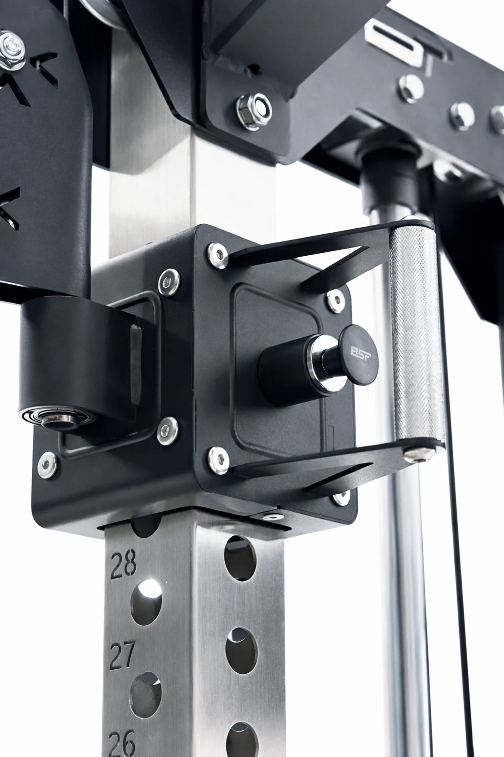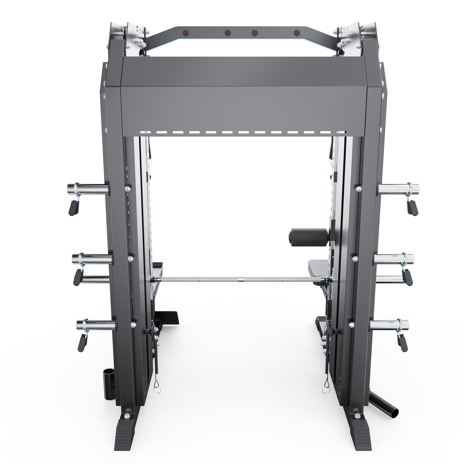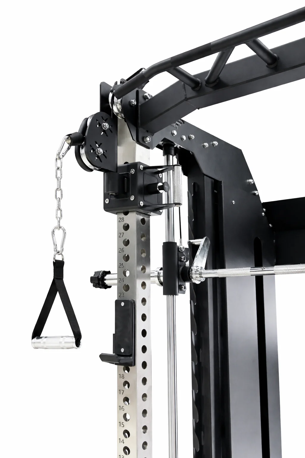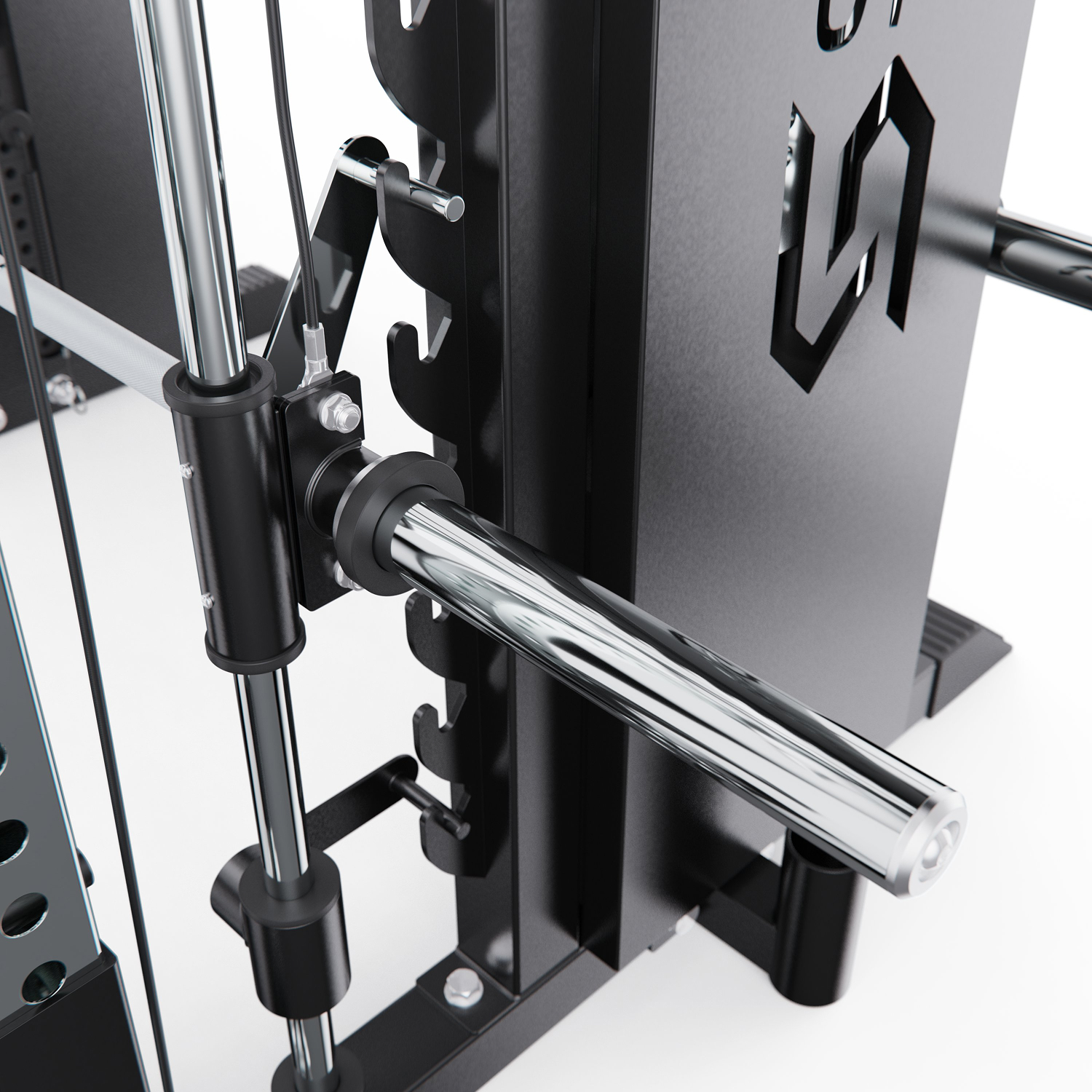 Мультистанция позволяет выполнять широкий спектр упражнений: занятия на кроссовере, приседания, выпады, тяги к поясу, упражнения на бицепс и трицепс, а также подтягивания на перекладине. В нижней части рамы предусмотрено специальное отверстие для выполнения упражнений в стиле Лэндмайн, что расширяет возможности тренировки плеч и корпуса.
