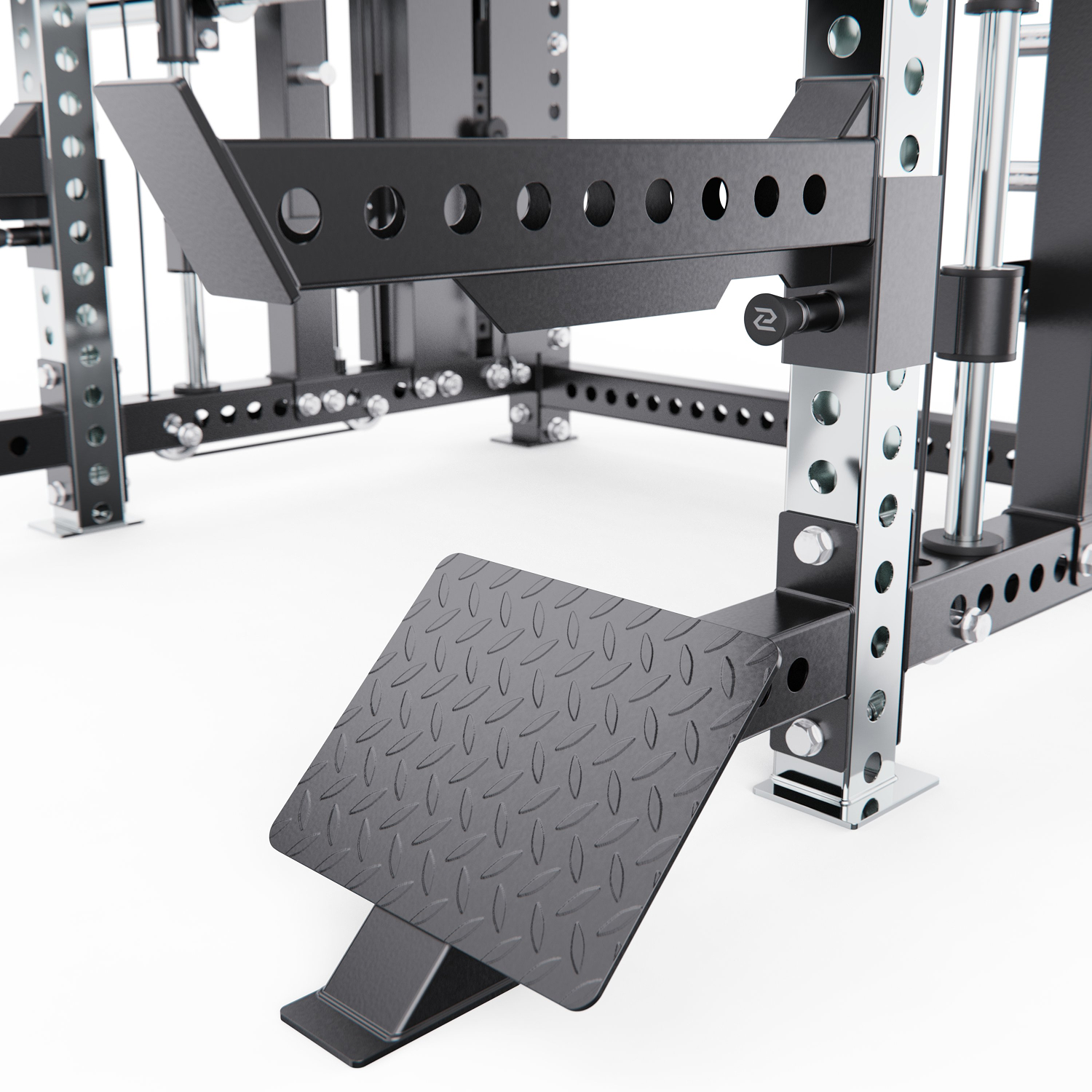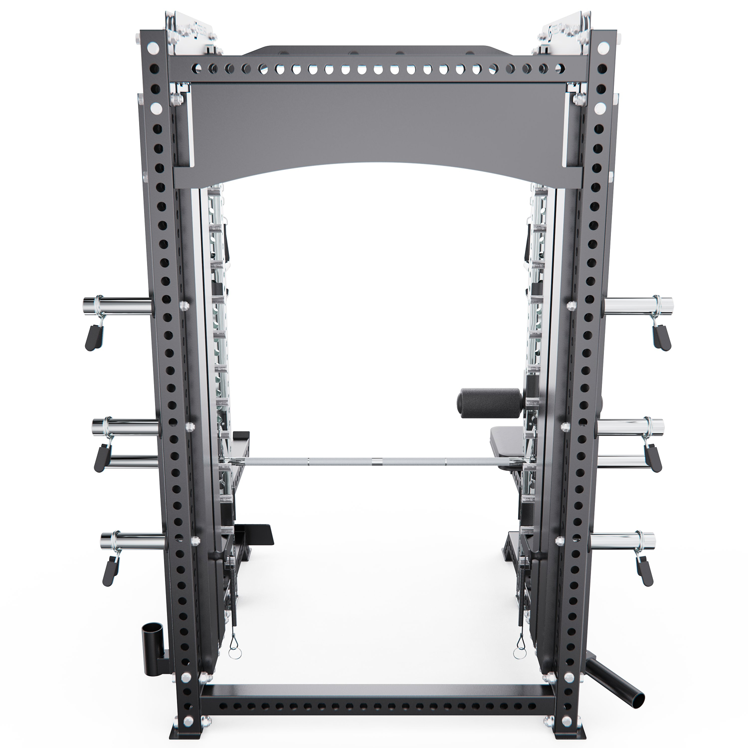 Мультистанция позволяет выполнять широкий спектр упражнений: занятия на кроссовере, приседания, выпады, тяги к поясу, упражнения на бицепс и трицепс, а также подтягивания на перекладине. В нижней части рамы предусмотрено специальное отверстие для выполнения упражнений в стиле Лэндмайн, что расширяет возможности тренировки плеч и корпуса.