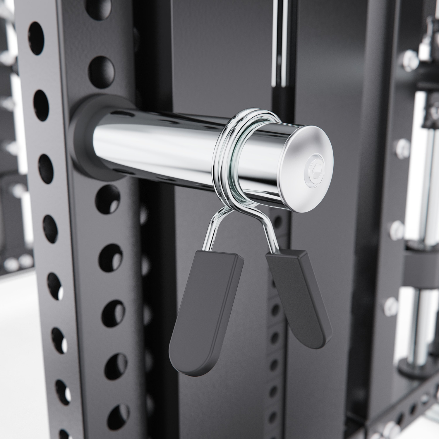 Гриф для приседаний имеет вес 22 кг и длину 201 см. Он регулируется по высоте и фиксируется на 14 уровнях, что позволяет точно адаптировать тренажёр под пользователя и выполнять упражнения с правильной техникой. Длина турника составляет 110 см, обеспечивая удобный хват для выполнения подтягиваний различными способами.