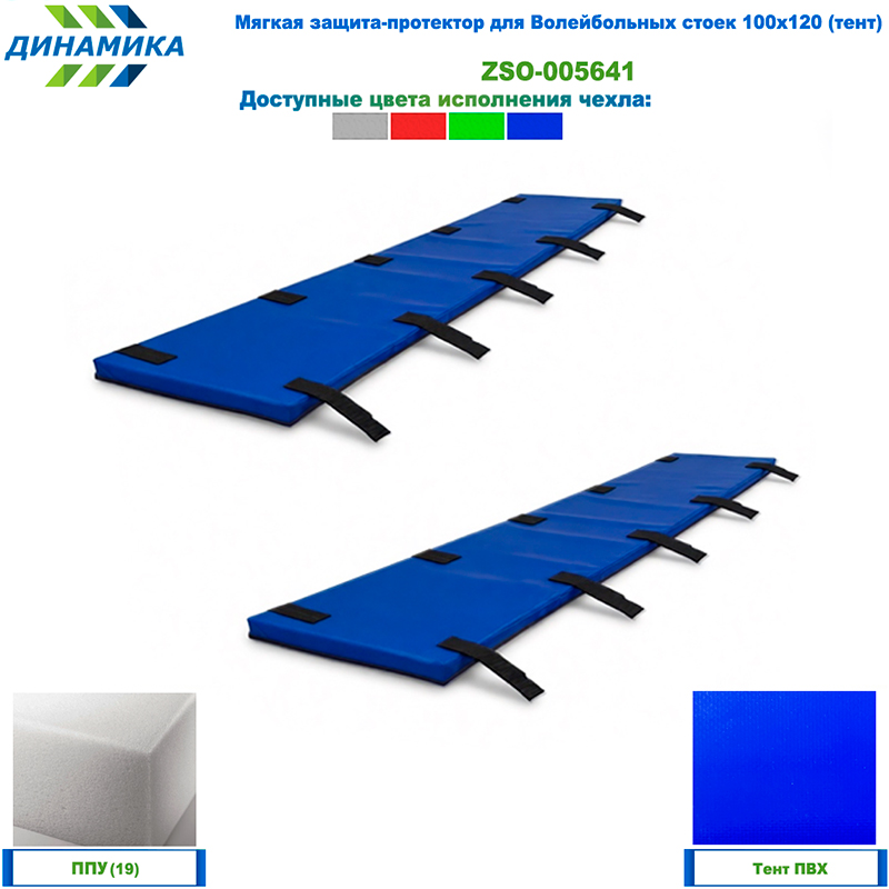 Мягкая защита-протектор для Волейбольных стоек - представляет собой пару мягких изделий, состоящих из чехлов сшитых из тента ПВХ и наполнителя - прочного поролона (ППУ - пенополиуретан плотностью 19,3 кг/м3). У модулей имеется молния со скрытыми замками для замены наполнителя. Защита оснащена липучками велькро для утягивания протектора вокруг стоек волейбольных.