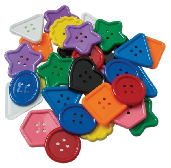 Большой набор из 90 разноцветных пуговиц, ширина каждой от 35 до 50 мм. На каждой пуговице по 4 отверстия для нанизывания. Пуговицы имеют различную форму: сердце, звезда, треугольник, квадрат, круг, овал, шестигранник, круг с волнообразными краями. Все детали упакованы в удобный пластиковый контейнер для хранения.