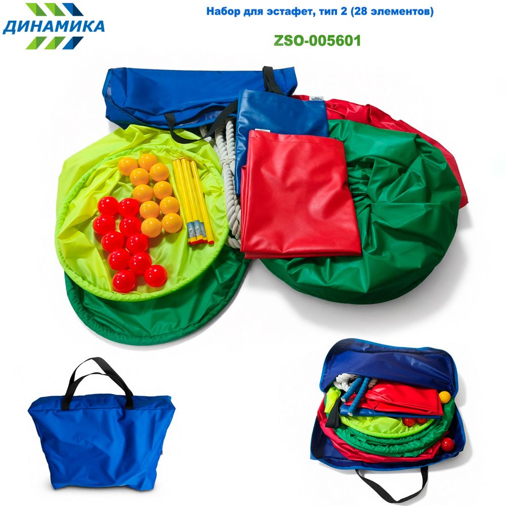 Набор для эстафет (тип 2) — полноценный комплект из 28 предметов для организации динамичных спортивных эстафет и активных игр на свежем воздухе или в помещении. В наборе есть всё необходимое для разнообразных соревнований: от перетягивания каната до лазания в тоннеле и сбора мячиков. Все элементы удобно хранить и перевозить в вместительной сумке — набор легко взять с собой в лагерь, на праздник или на пикник. Развивает ловкость, скорость, координацию, командный дух и стратегическое мышление. Подходит для групповых игр от 4 до 20 участников.