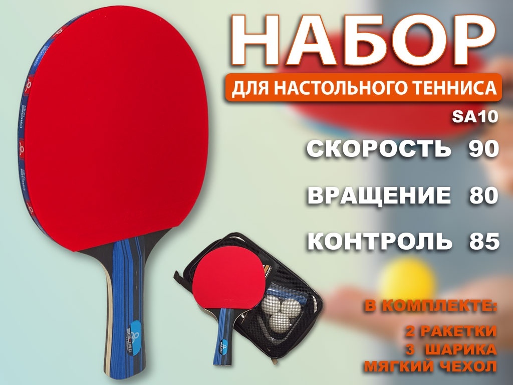 Набор для игры в настольный теннис с 2 ракетками и 3 шариками в комплекте. Такое сочетание в покрытие ракеток лучше всего подходит для скоростной атакующей игры без сильного вращения, а также для активной защиты подрезками. Ручка ракетки удобной конической форма и не доставляет дискомфорта во время игры. Основание ракетки изготовлено из дерева. Накладки состоят из губчатого слоя, а так же гладкой и шипованной поверхности.