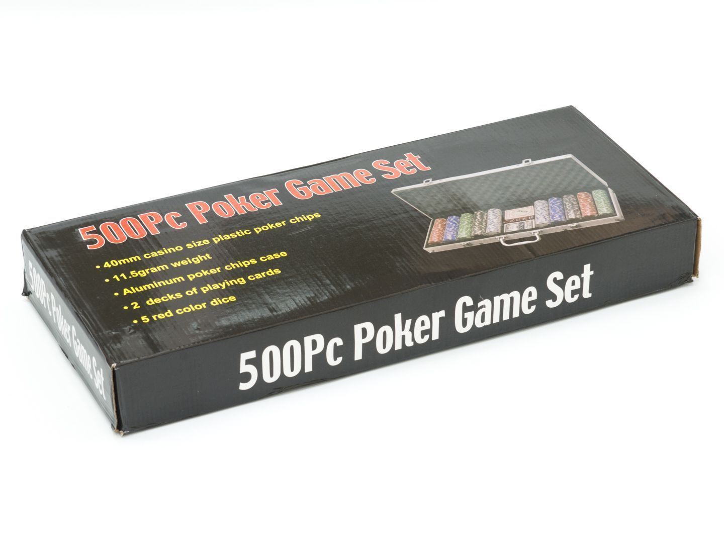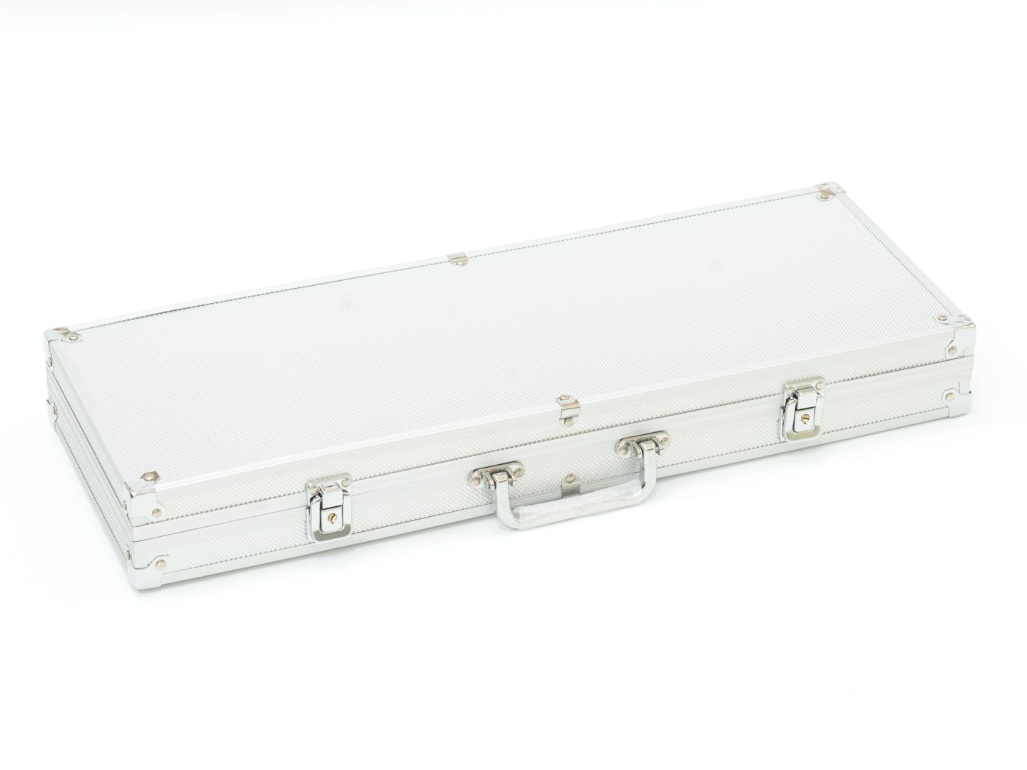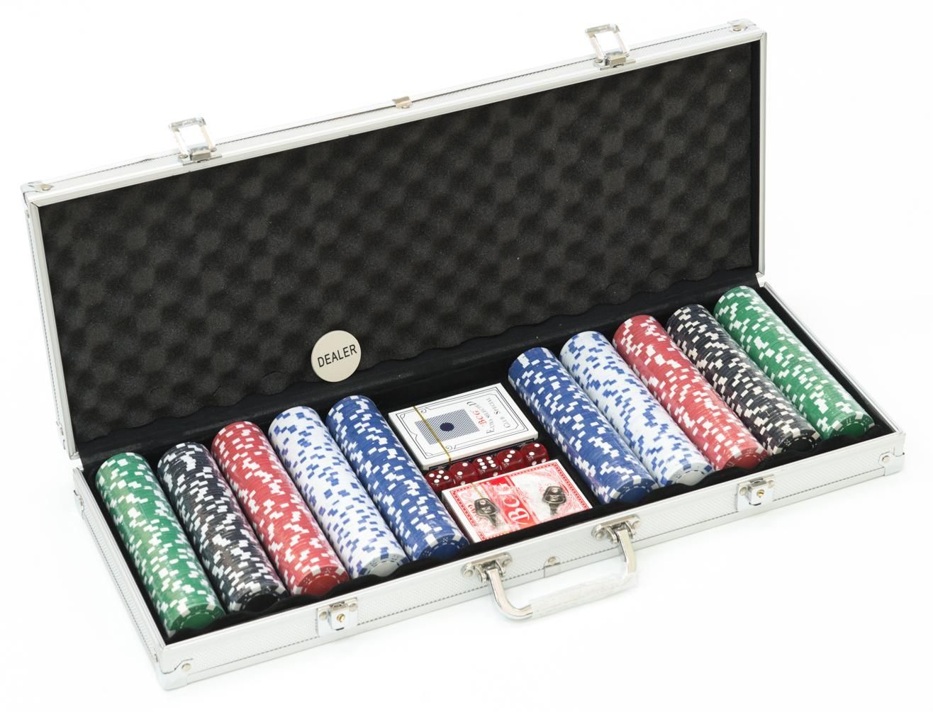 Алюминиевый кейс с внутренней обивкой из поролона. Для сохранности содержимого запирается на замки. В комплект входят: 100 красных, 100 зеленых, 100 белых, 100 черных и 100 синих фишек, 2 колоды карт, кости, фишки дилера, ключи от кейса. Фишки размещаются в специальных ячейках с пластиковыми перегородками, обитыми тканью.