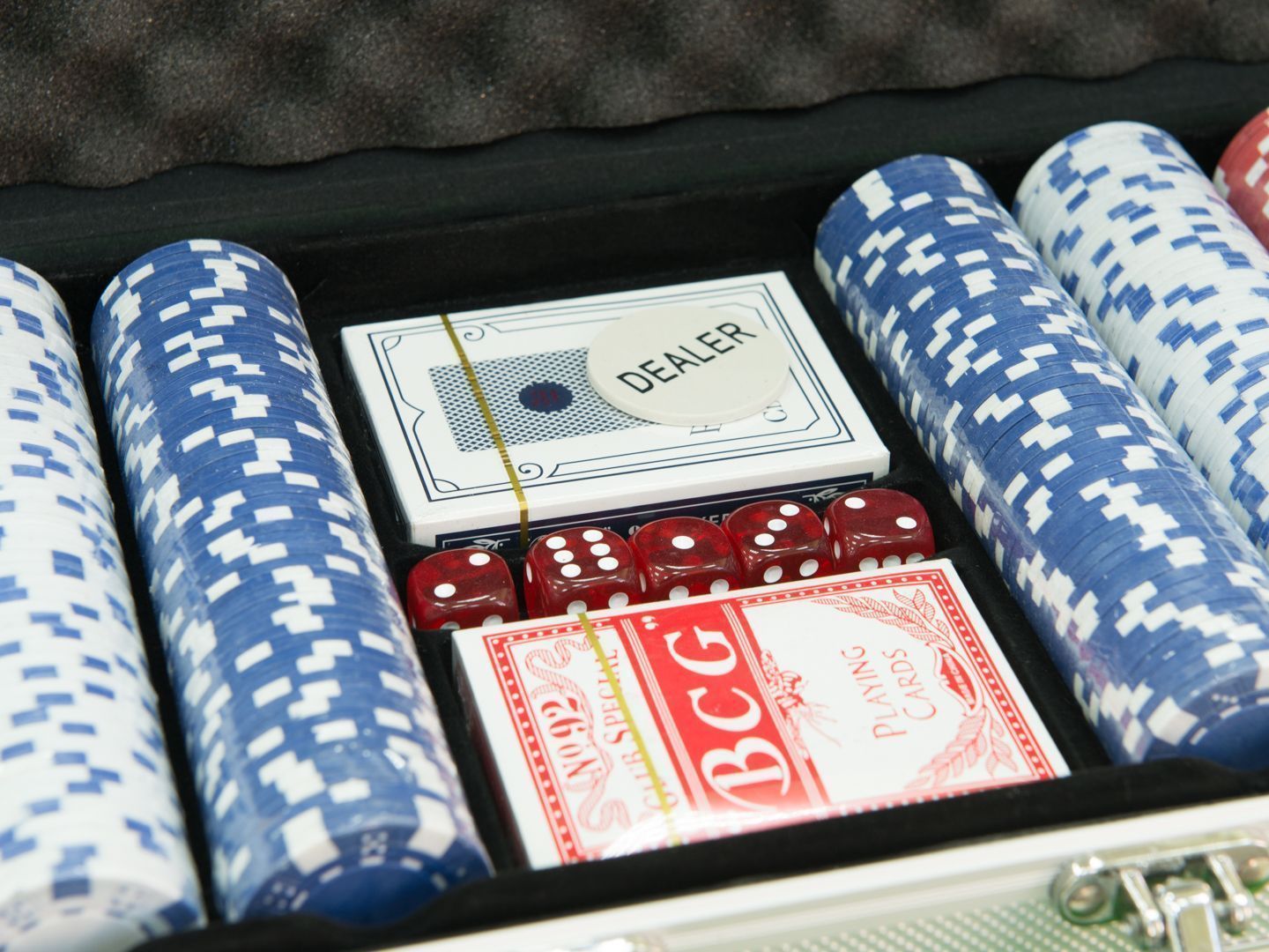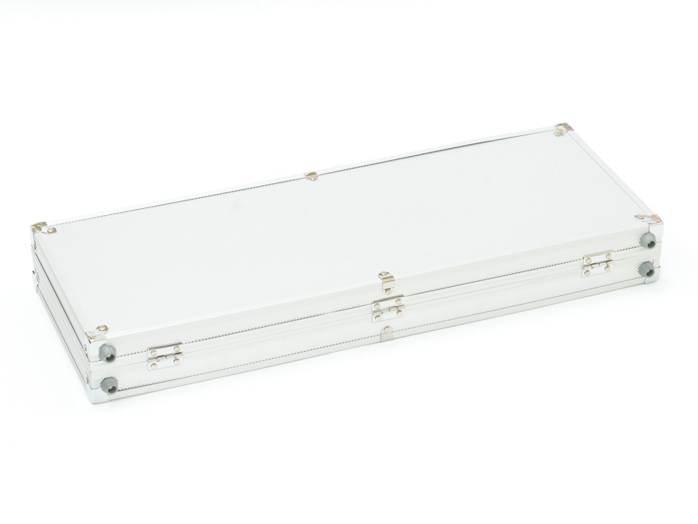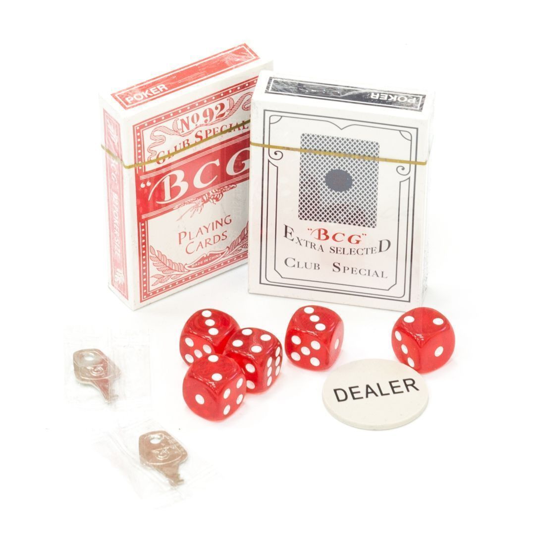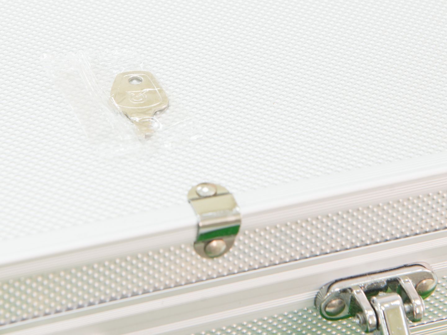 Алюминиевый кейс с внутренней обивкой из поролона. Для сохранности содержимого запирается на замки. В комплект входят: 100 красных, 100 зеленых, 100 белых, 100 черных и 100 синих фишек, 2 колоды карт, кости, фишки дилера, ключи от кейса. Фишки размещаются в специальных ячейках с пластиковыми перегородками, обитыми тканью.
