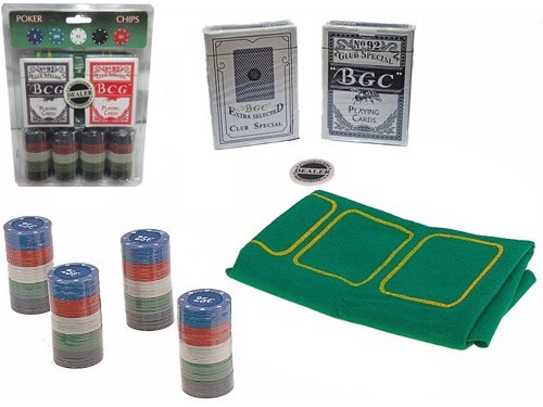 100 фишек и 1 фишка дилера (полипропилен), 2 колоды игральных карт (картон), сукно с игровым полем (полиестер)