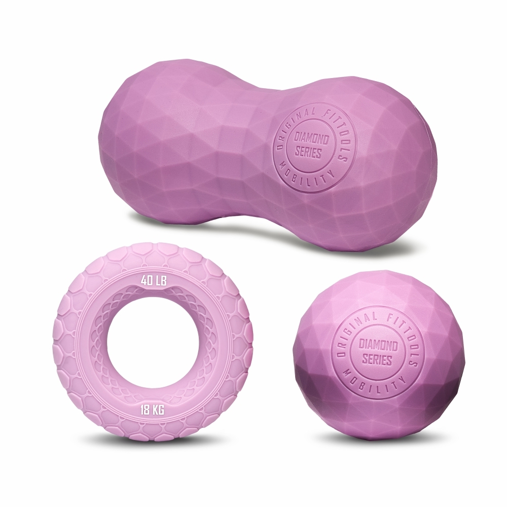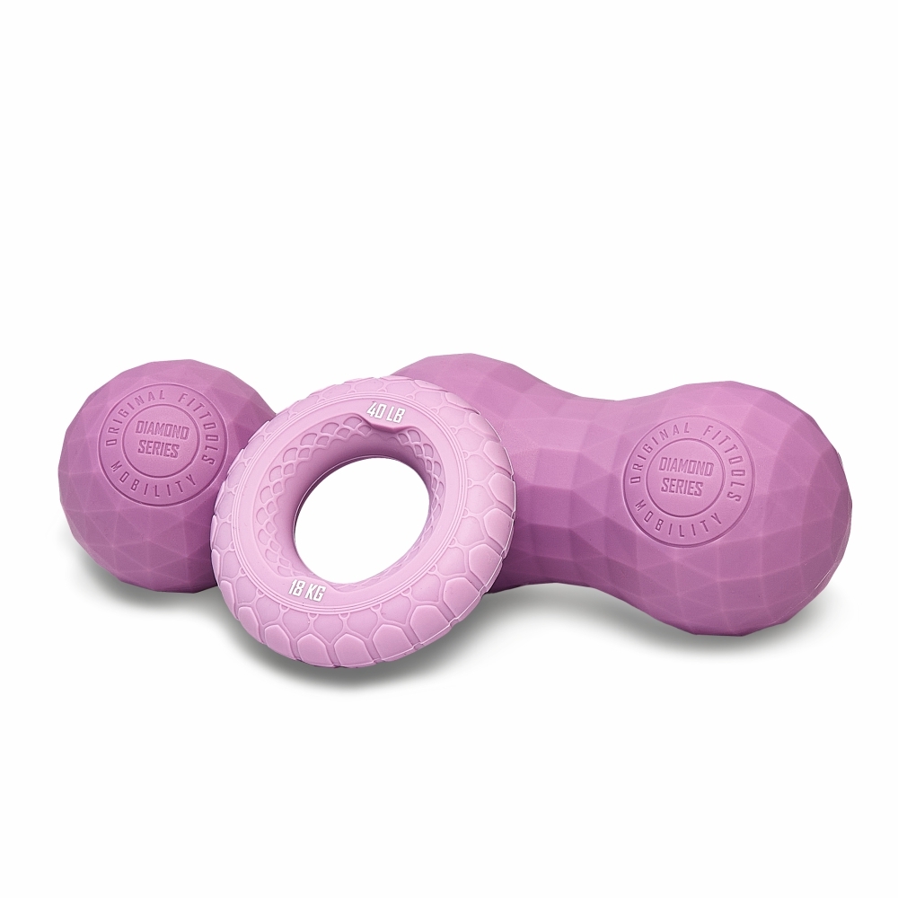 Стильный и функциональный набор предназначен для разнообразных занятий по укреплению мышц, улучшению кровообращения и реабилитации. В комплект входят два массажных мяча — одинарный и сдвоенный, а также кистевой эспандер. Все предметы выполнены из высококачественного литого силикона с многогранной поверхностью, обеспечивающей дополнительно массажное воздействие и превосходные тактильные ощущения. Мячи не проминаются, оставаясь упругими при использовании, что позволяет эффективно прорабатывать различные зоны тела.Основные характеристики: