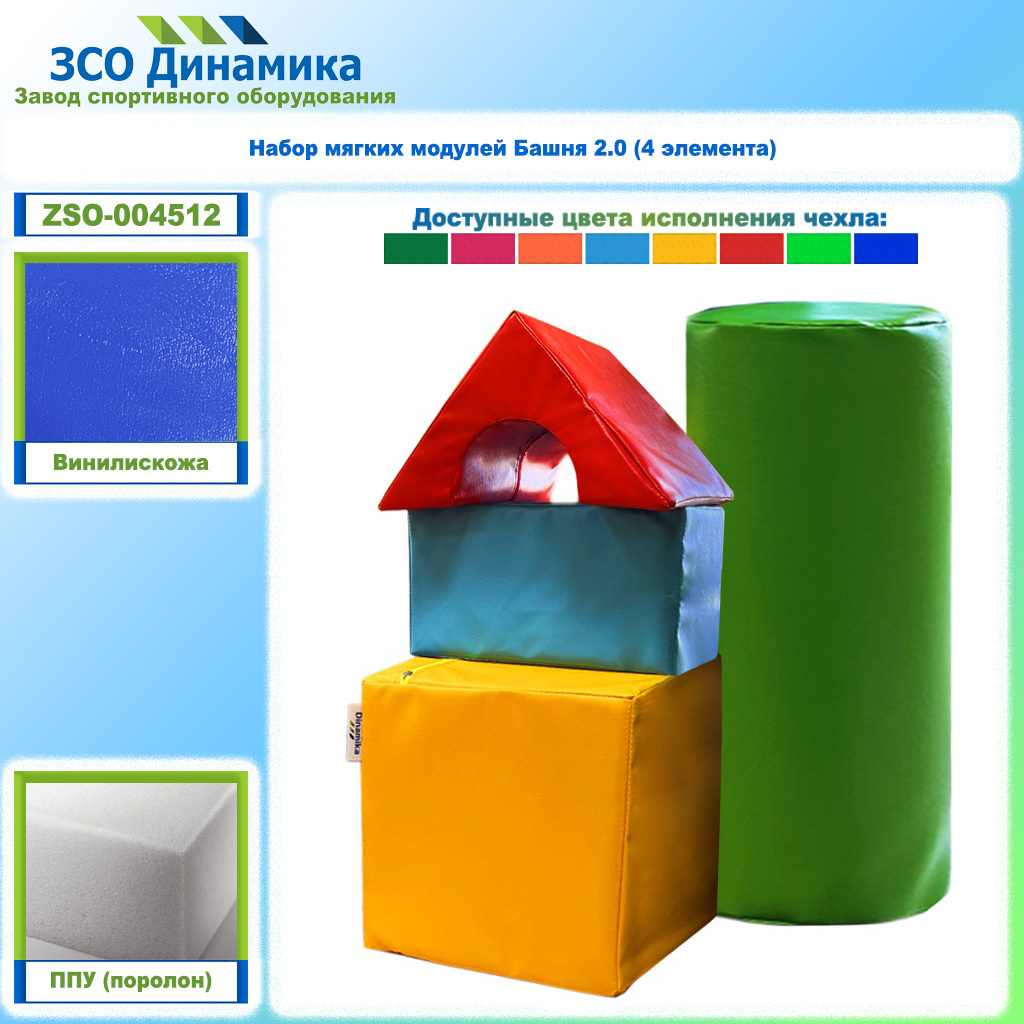 Набор мягких модулей Башня представляет собой комплект мягких изделий, состоящих из чехлов сшитых из винилискожи и наполнителя - прочного поролона (ППУ - пенополиуретан плотностью 19,3 кг/м3). У модулей имеется молния со скрытыми замками для замены наполнителя.