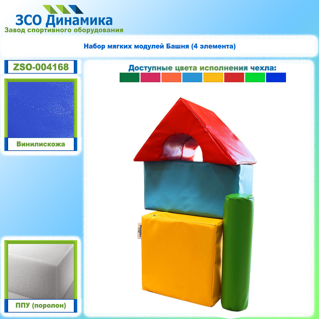 Набор мягких модулей Башня представляет собой комплект мягких изделий, состоящих из чехлов сшитых из винилискожи и наполнителя - прочного поролона (ППУ - пенополиуретан плотностью 19,3 кг/м3). У модулей имеется молния со скрытыми замками для замены наполнителя.