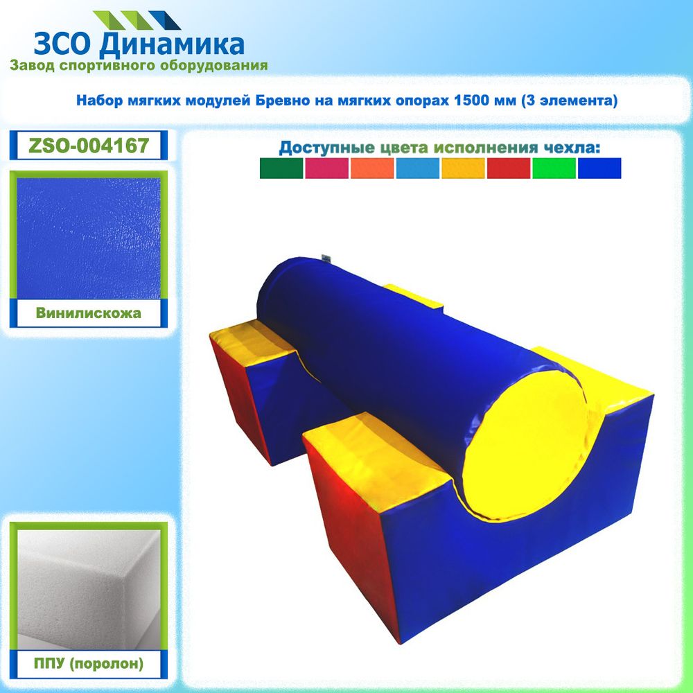 Набор мягких модулей бревно на подставках представляет собой комплект мягких изделий, состоящих из чехлов сшитых из винилискожи и наполнителя - прочного поролона (ППУ - пенополиуретан плотностью 19,3 кг/м3). У модулей имеется молния со скрытыми замками для замены наполнителя.