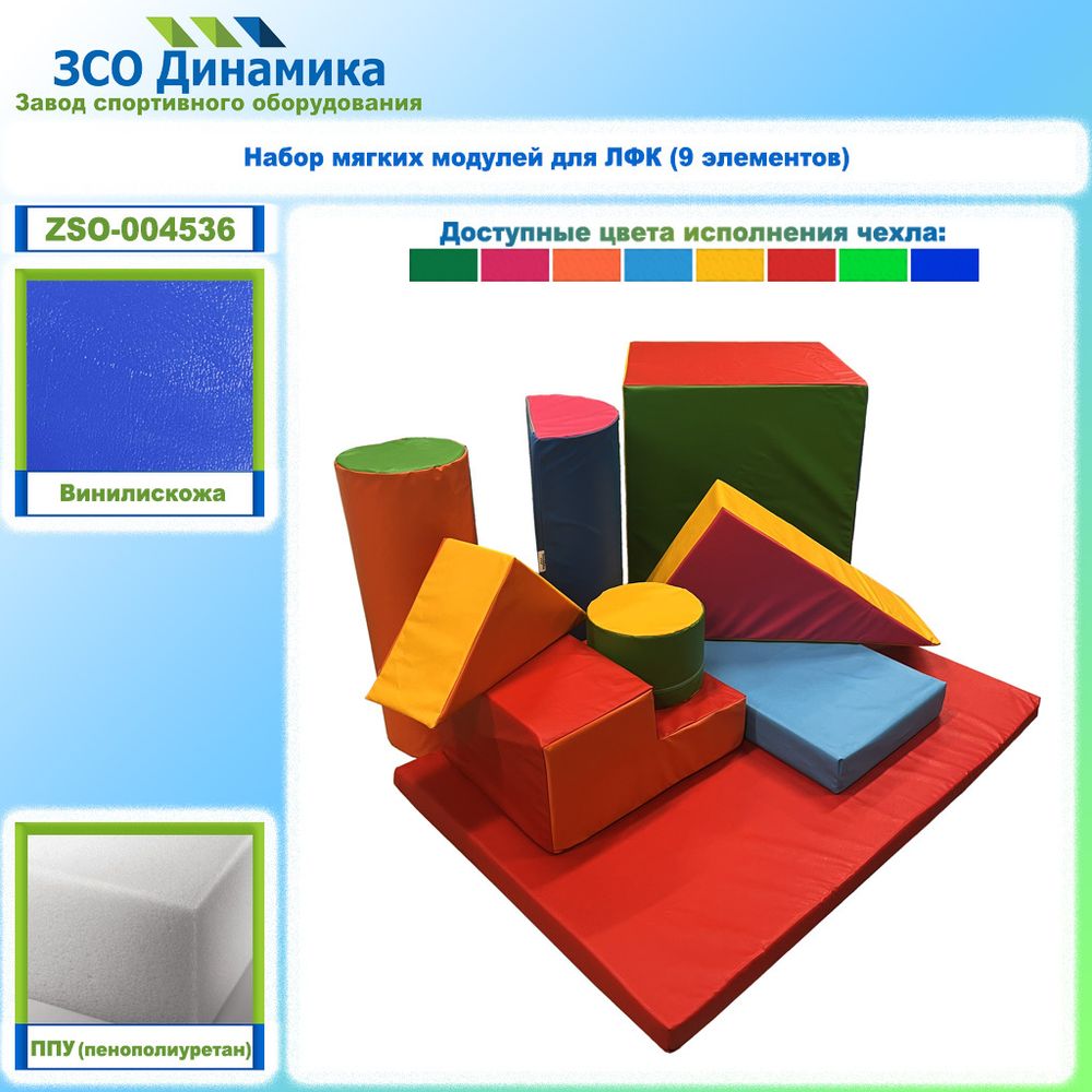 Набор мягких модулей для ЛФК представляет собой комплект мягких изделий, состоящих из чехлов сшитых из винилискожи и наполнителя - прочного поролона (ППУ - пенополиуретан плотностью 19,3 кг/м3). У модулей имеется молния со скрытыми замками для замены наполнителя.